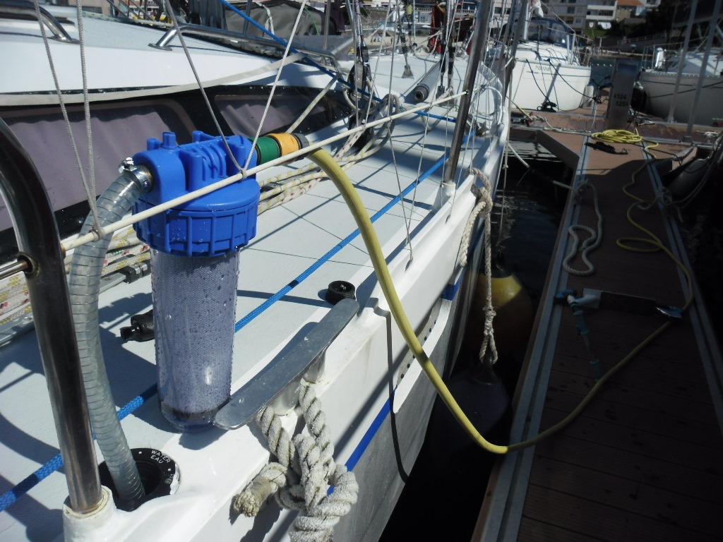 Nous pouvons stocker jusqu’à 400 litres dans deux réservoirs situés en fond de cale. Au port, nous faisons le plein d’eau ; au mouillage, le dessalinisateur, qui a un bon débit (1,6 l/mn ou 100l/h), est de service.