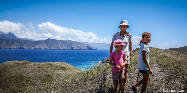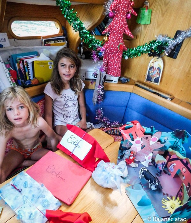 Le 24 décembre, à 22h, nous jetons l’ancre dans le noir le plus total devant Vaitahu, le village principal de Tahuata. Au petit matin, les cloches carillonnent, appelant la population à célébrer la naissance du Christ. Soupir lourd de sommeil sur l’Ovni, les parents hagards déclarent : « dans l’hémisphère sud, vu le décalage horaire avec la Laponie, Noël se fête le 26 ». Nous avons une journée de répit pour trouver de la nourriture, préparer un bon repas et extraire des cales les cadeaux cachés.