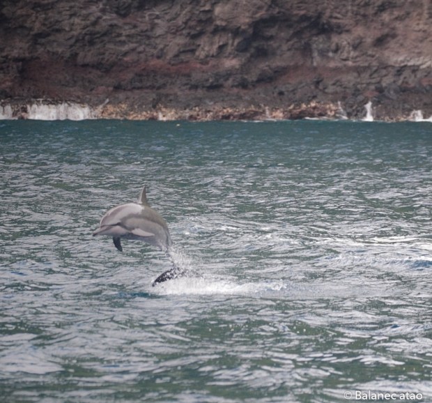 Aux Marquises, partout où le regard se porte, il incite à prendre de la hauteur. Une croix, un mont, un pétroglyphe remarquable ou des crêtes bien ciselées, et nous voilà partis pour 3 heures minimum d’efforts et de sueur. Les enfants sont fidèles à eux-mêmes : ça gémit à la montée, ça cavale à la descente. Ces « promenades de santé » prennent la place de nos activités nautiques. Faute de barrière de corail, pas de lagon ; l’eau, plutôt sombre et agitée, se prête alors mal à la baignade. A Hapatoni, néanmoins, nous avons la chance inouïe de nager avec des dauphins électre. Ceux-ci ont l’habitude de se reproduire dans la baie d’Hanatefau. Plusieurs jours durant, nous les voyons, en surface et sous l’eau, en petits groupes, aller et venir entre les bateaux et exécuter des pirouettes fantastiques. Quel plus beau spectacle de bienvenue !