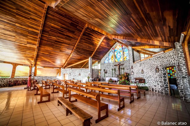 Tahuata – qui signifie « lever de soleil » en marquisien – est la plus petite île habitée ; elle compte en tout et pour tout 670 habitants. Mais quelle église ! Inauguré en 1988, le monumental édifice (financé par le Vatican) est construit en galets et pierres taillées volcaniques. La voûte lambrissée, les sculptures en bois et les vitraux naïfs créent une atmosphère grandiose et intime à la fois. Plus large que long, ce lieu de culte donne l’impression de tutoyer le divin qui serait assis à notre côté au lieu d’être tout en haut ou tout au fond, loin des petites gens. À la sortie de l’office, une femme m’interpelle : « j’ai quelque chose pour toi ». De son sac à main riquiqui, elle sort deux jolies mangues jaunes. Sympa l’accueil !
