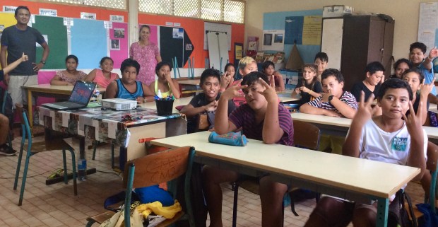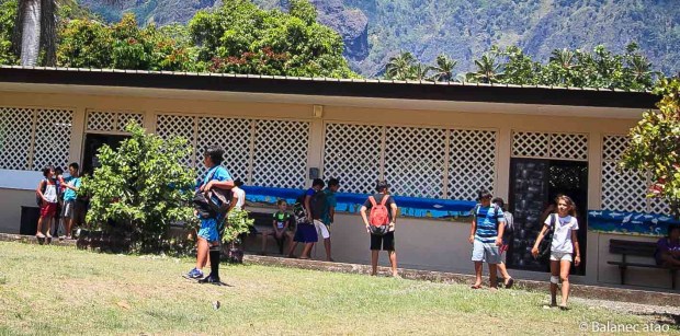 Escale rallongée à Hiva Oa pour cause d’école sympa. Coline (11 ans) et Erell (7 ans) nous font visiter l’école primaire publique d’Atuona qui compte 130 élèves, 10 poulettes et un chien.
