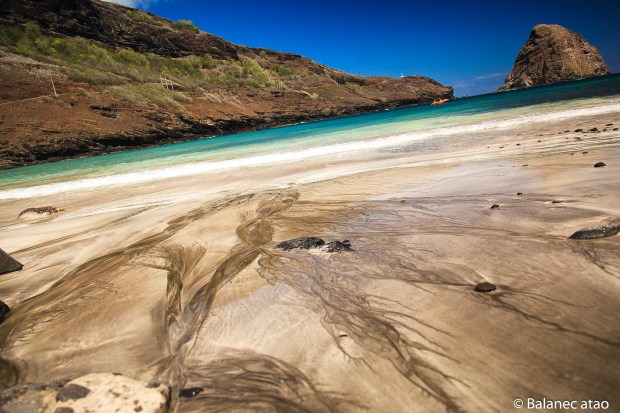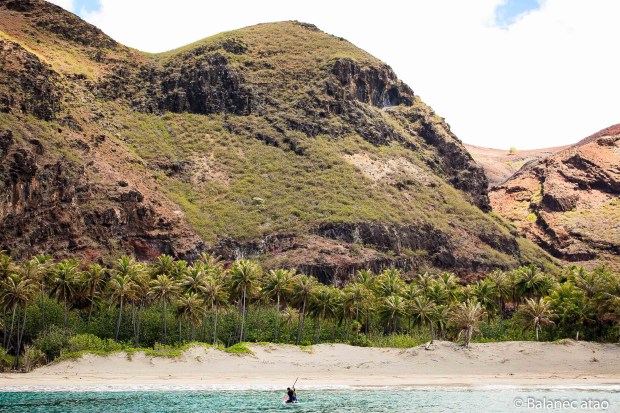 Le capitaine part en maillot le long de la falaise, récupère son matériel de plongée laissé sur les rochers et crawle jusqu’à Balanec. Là, il démarre l’annexe et s’approche de la plage. Il décide de jeter l’ancre à un endroit calme où, depuis une heure, nous n’avions vu aucune vague casser. Jean-Marie descend alors de l’annexe pour nous aider à porter les sacs (appareil-photo, chaussures, 7 kg de mangues !). En un clin d’œil, une série de vagues s’annonce et l’embarcation commence les montagnes russes. En courant, le capitaine revient sur ses pas, saisit le boute relié à l’ancre. Coline nous décrit la scène : « Papa tenait l’annexe quasiment à la verticale, on aurait dit qu’il essayait de dompter un cheval cabré sur ses pattes arrière ! » La suite est moins chevaleresque.