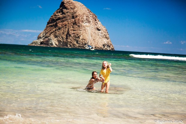 Pour excursionner à terre, nous avions pourtant mis en place une stratégie prudente. Toute la famille embarque dans l’annexe en direction de la plage ; près du bord, femme et enfants sautent à l’eau, les sacs au dessus de la tête façon « Rangers ». Le capitaine ramène l’annexe au voilier, chausse ses palmes, enfile son masque et rejoint à la nage la côte rocheuse voisine. Une fois sur les cailloux, il se trace un chemin tant bien que mal jusqu’à la plage. Étape 1 réussie ! Nous serons moins chanceux pour le retour.