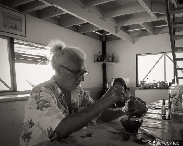 Installé au calme, éclairé par l’éblouissante réverbération du lagon, Josh recueille, une par une, les précieuses perles et surgreffe dès que possible. C’est-à-dire qu’il ajoute, à l’emplacement de la perle tout juste retirée, un nucléus (bille en en coquille) plus gros que le précédent, espérant, d’ici un an, une deuxième perle encore plus volumineuse. L’opération est délicate et stratégique et Josh, tout concentré qu’il est, nous en explique toutes les subtilités.