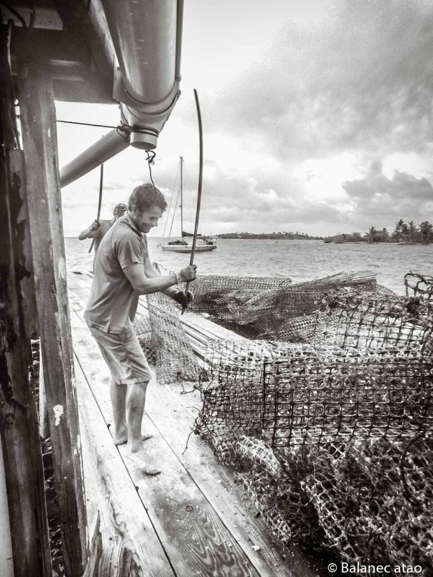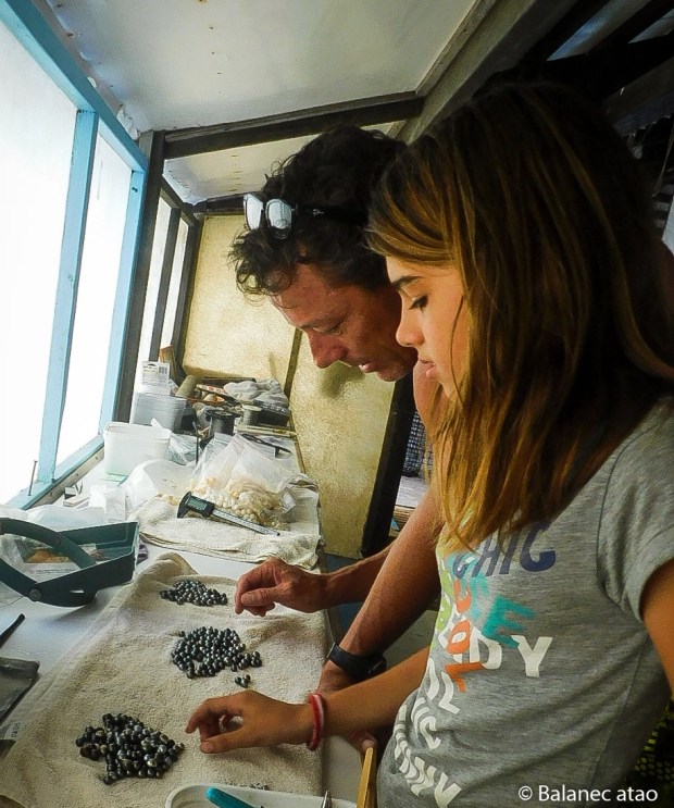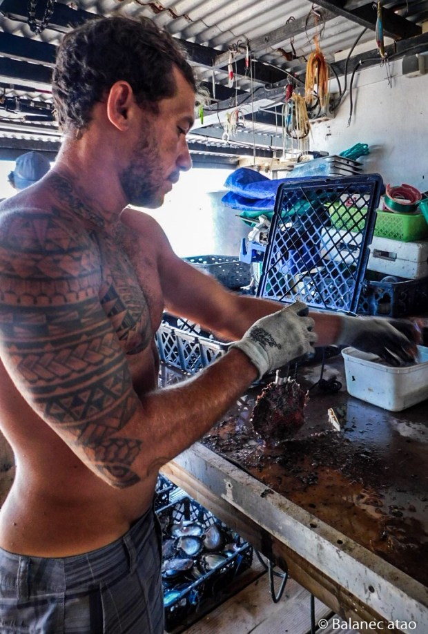 Dès l’aube, le tandem tahitien – Arii et Davy – va chercher en barge les nasses situées à moins d’un mille de la ferme. Les deux plongent en apnée à une dizaine de mètres pour détacher des bouées les chapelets d’huîtres puis les ramènent à la ferme. Commencent alors plusieurs travaux manuels : du côté de Davy et d’Arii, ça manie le couteau, le racloir, la perceuse, le bâton… Du côté de Josh, ça joue du scalpel et de la pince.