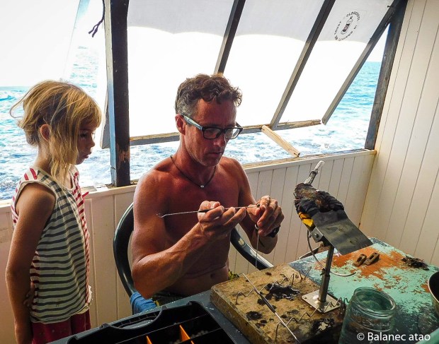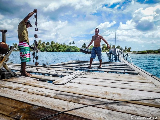 Patrick, son fils Josh, Davy et Arii nous accueillent à bras ouverts. Ils nous lancent une amarre, nous invitent à prendre le café, à déjeuner de leur pêche, à dîner… nous finissons par y passer nos journées, tout naturellement.