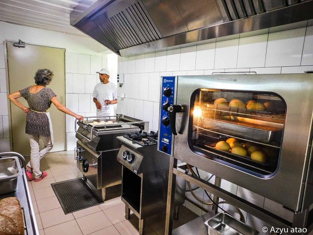 Outre ce défi de faire apprécier un pain semi-complet au levain, il a également relevé celui de cuisiner, pendant 10 jours, pains, brioches, gâteaux, desserts pour un groupe de touristes vegan, c’est-à-dire sans œuf ni lait ni miel. J’ai eu la chance de l’assister une journée dans un laboratoire professionnel de cuisine me chargeant de la réalisation du « poe mautini ». C’est un dessert polynésien qui associe la courge, la farine de manioc et le lait de coco sous forme de purée gélatineuse. Une « lichouserie » !