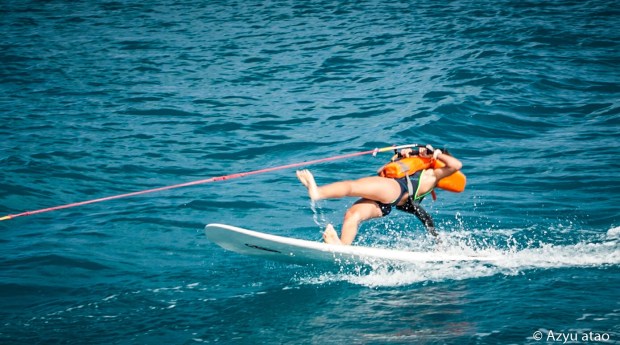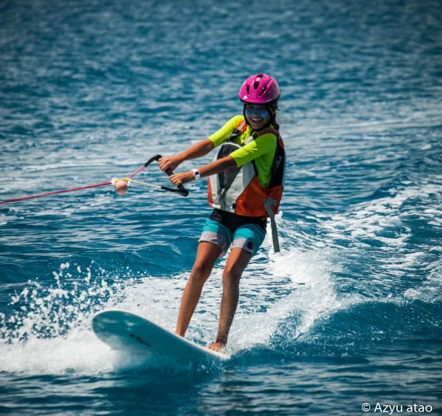 À Fakarava, Coline s’initie au surf tracté et au wake-board !