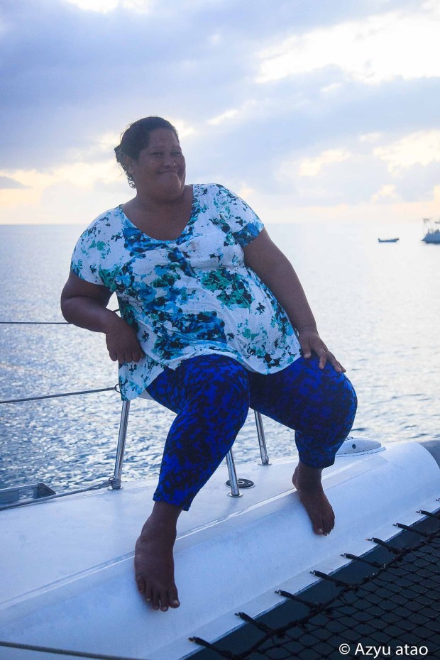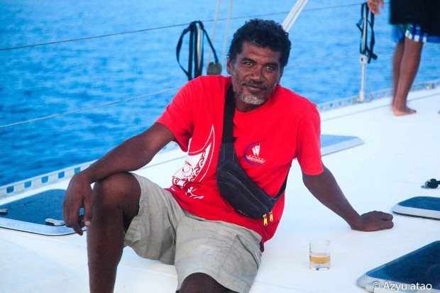 Dès le lendemain, ils sont invités à déjeuner sur Azyu. En embarquant, ils nous passent un collier odorant de tiare autour du cou et je reçois des boucles d’oreilles en perles de culture. Dans une ambiance décontractée animée par la musique paumotu, ils sirotent des Hinano, la bière de Tahiti, et passent des heures dans l’eau, excités de se baigner « en pleine mer ». De toute évidence, c’est une belle journée de vacances pour eux. Le repas, précédé d’une prière et apprécié en silence, semble également un moment symbolique dont je mesure mieux le sens et l’importance par rapport à l’année dernière. En juillet dernier, Anelia et Michel avaient préparé un repas exclusivement pour nous puisque la table ne comprenait que quatre couverts ! Dans l’ouvrage Nourritures, abondance et identité, Christophe Serra Mallol explique que : « Ne pas accueillir et partager est véritablement honteux aux yeux des Tahitiens [cela va] parfois même jusqu’à embarrasser un visiteur en lui offrant une hospitalité hors mesure. »