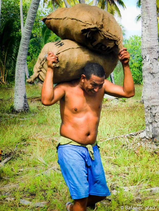 Depuis quelques mois, Anelia et Michel se sont installés dans une maison en palme au sein d’une cocoteraie familiale au lieu-dit Onokanoka ; sur ce terrain, ils exploitent les noix de coco qu’ils cassent et en détachent la chair appelée coprah. Dans le lagon, ils pêchent poissons, bénitiers et divers mollusques pour se nourrir.