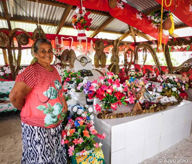Avant de prendre congés, Anelia souhaite me montrer le « fare de son père », aligné aux autres maisons de la rue. Elle m’introduit dans une maison en dur de bonne taille ; il se passe quelques secondes avant que je ne comprenne : une tombe carrelée trône au milieu d’une pièce unique surchargée de décorations – colliers de coquillages, guirlandes végétales, éventail en niau, bouquets de fleurs en plastique et divers souvenirs sur les murs. Tous les membres de la famille nous y retrouvent et, en guise d’adieu, nous couvrent de cadeaux. Chapeaux tressés, paréo avec son attache en nacre, colliers de coquillages, paniers en fibres de pandanus, tee-shirts à l’effigie de Makemo… À nouveau, nous sommes surpris par l’excès de présents mais, comme l’indique Christophe Serra Mallol sur l’hospitalité traditionnelle en Polynésie, « le don appelait le contre-don », « à l’obligation de donner correspondait l’obligation de rendre », précisant que, dans les temps anciens, « il a toujours été nécessaire de partager avec son voisin affamé les provisions plus ou moins abondantes qu’on avait pu se procurer afin de recevoir le même service une autre fois. » Nous leur offrons une lampe solaire qui leur sera très utile car il n’y a pas d’électricité au secteur et promettons de repasser d’ici quelques mois. Ainsi naît l’amitié en commençant par donner.