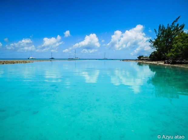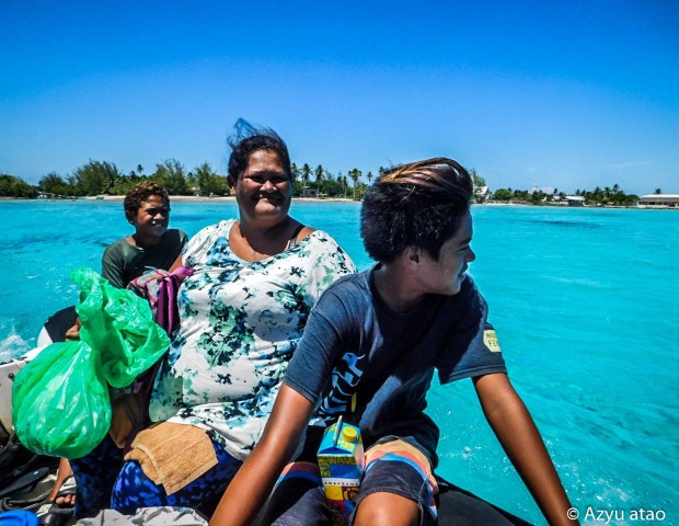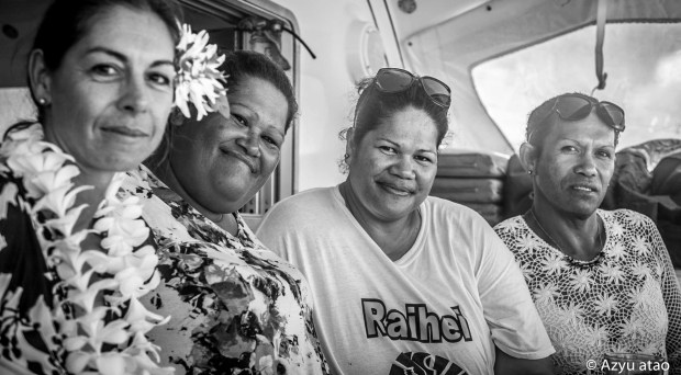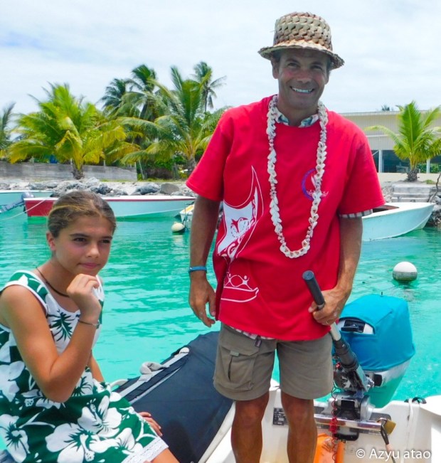 Le lendemain, alors que nous sautons de l’annexe sur une berge corallienne, nous reconnaissons leur fils de 11 ans ; Moana Nui se baigne avec ses copains dans le hoa, une fausse passe, qui sert de port aux speed-boat. Quelques minutes plus tard, il alerte ses parents arrivant tout juste au village en scooter. Leur étonnement de nous revoir est grand ! La sœur d’Anelia, Faiti, apparaît derrière un frangipanier, leur « frère » – un raerae qui se fait appeler Catia – nous rejoint dans son short moulant et son haut en dentelle. S’ajoutent un neveu, un oncle, et les retrouvailles sont quasi complètes !
