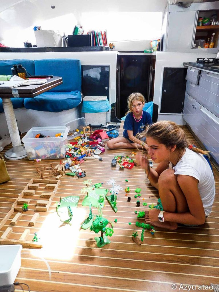 Incroyablement bien ! Nos filles ont toujours préféré les longues navigations aux courtes sorties à la journée. D’office, Coline a concocté un programme scolaire ambitieux pour elle et sa sœur. Notre dicton : « l’école, c’est tous les jours, sauf quand ce n’est pas possible » s’est transformé en : « l’école, c’est tous les jours ». Il est vrai que ça occupe bien la matinée. Aller à terre ne leur manque vraiment pas. Coline lit des centaines de pages par jour, Erell engloutit des dessins animés. Elles se baignent, cuisinent des gâteaux au four solaire, installent leur monde Playmobil dans tout le catamaran, jouent avec la chatte prénommée Marquise… Les journées passent vite, même celles qui se déroulent dans un doux ennui.