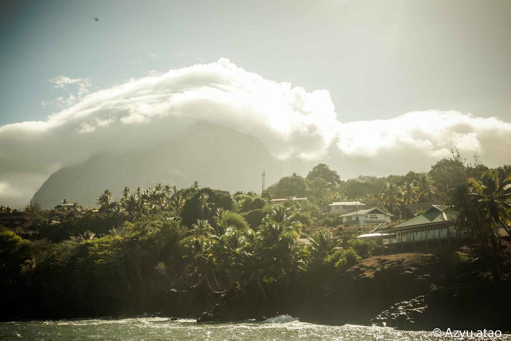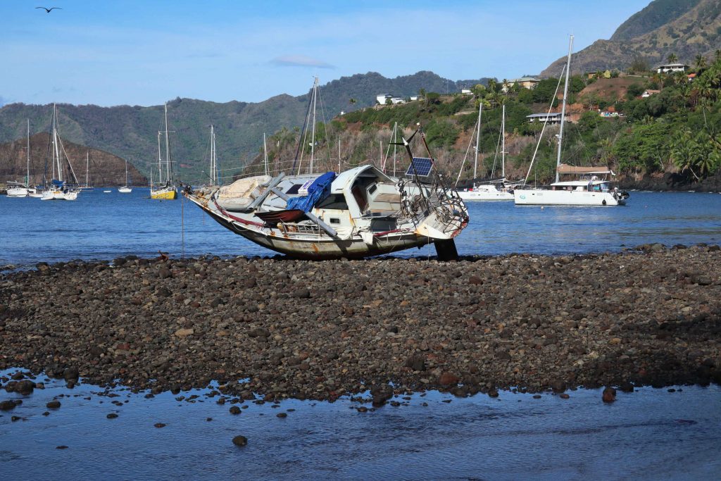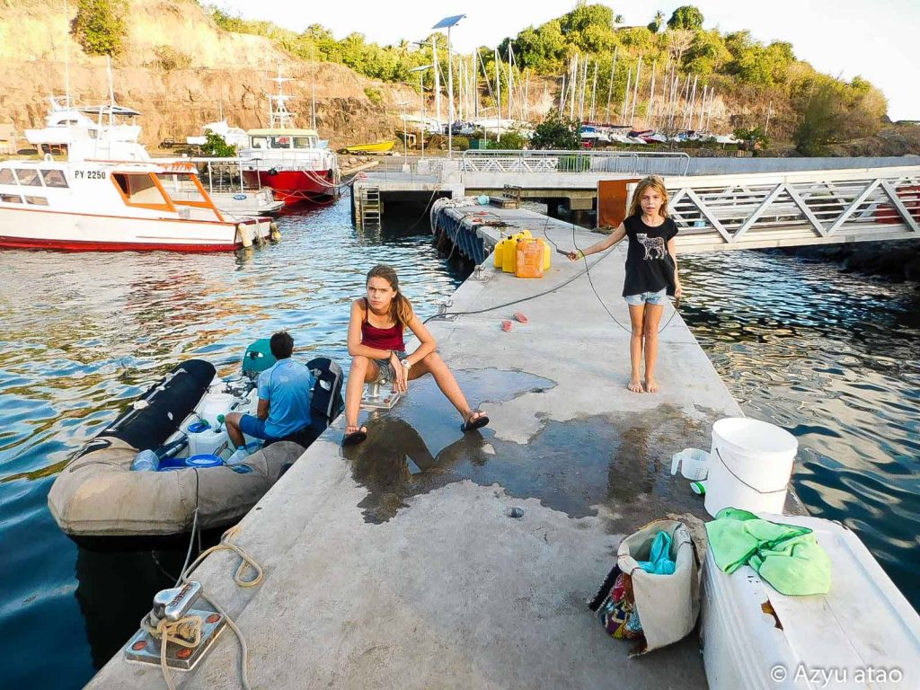 Une trentaine de voiliers se serrent dans la baie de Tahauku. Les plus chanceux se sont glissés dans le port, protégés du large par un remblais. C’est le cas d’Azyu ancré par devant et par derrière ; la place étant limitée, les bateaux ne peuvent éviter de sorte que les ancres se multiplient. Quand l’un d’eux veut bouger de quelques mètres, pour s’éloigner de la côte rocheuse par exemple, il doit parfois démêler un sac de nœuds au fond de l’eau.
