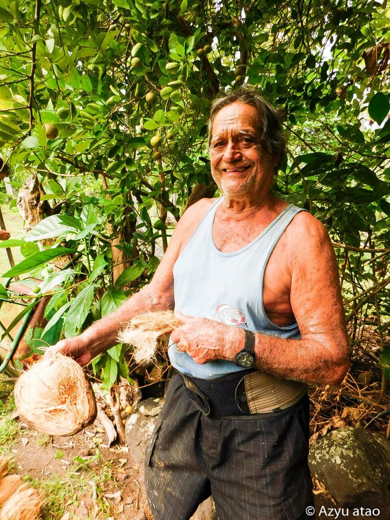 Sous un toit de palme, un vieil homme de 78 ans semble nous guetter et nous attendre. Aussitôt, Awon nous conduit chez lui, remplissant, sur le chemin, nos sacs de citrons et goyaves. De ce jour et les 3 qui suivront, nous déjeunerons dans son fare, Awon ayant à cœur de cuisiner pour nous. Il utilise uniquement les produits qui poussent ou nagent ou grognent dans la nature : cochon braisé, pain, poisson cru, bananes plantain bouillies, fruit à pain transformé en purée… absolument tout baigne ou est imprégné de lait de coco qu’il extrait de la noix chaque jour, comme un rituel. Hormis le café en poudre, toute sa nourriture provient exclusivement des alentours. Sa liste de courses ne doit comporter que trois lignes : farine, sucre, allumettes (il ne boit pas d’alcool).