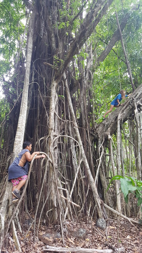 Mouna, 9 ans, qui était dans la même classe que Erell en février-mars, nous sert de guide. Il joue bien son rôle en dépit de sa timidité et d’une certaine difficulté à parler en français. Il nous amène devant un banyan tentaculaire : près de 10 troncs se rejoignent par le biais de racines aériennes formant un seul arbre gigantesque. Alentour, les murets en pierre et les paepae (esplanades religieuses en pierre volcanique) effondrés donnent une impression de grandeur ancienne et d’abandon. Le lieu est calme, silencieux, même les oiseaux s’abstiennent de chantonner. Il est propice au recueillement… mais le neurone du cueilleur se met à clignoter et nous remplissons nos sacs de jamblons (fruits noirs juteux comme des raisins), de citrons, de pamplemousses, de basilic sauvage et de pourpier.