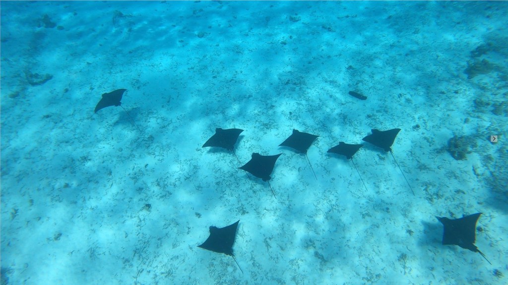Elles sont plus de six, papillonnant dans le courant, bougeant juste ce qu’il faut de leurs nageoires gracieuses pour se maintenir en stationnaire, à 4 mètres de profondeur. Alors, comme elles, on ralentit notre respiration, on fait onduler nos palmes calmement, on s’immobilise… Qu’elles sont jolies, noires tachetées de points blancs, prolongées d’une longue queue fine comme un ruban de demoiselle. Et ce curieux bec pointu qui leur a donné le surnom « d’aigles de mer ».