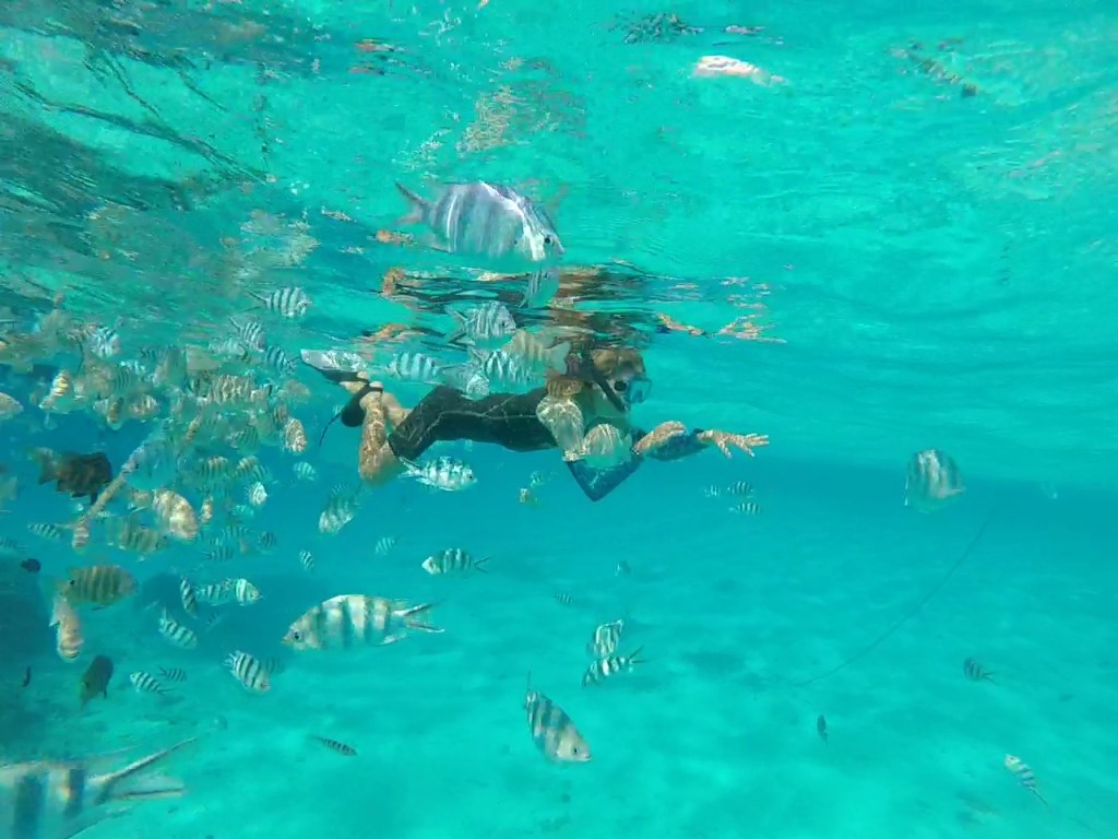 La fête n’est pas finie. Un peu plus loin, trois nageurs poussent des cris de joie. Des poissons bagnards – livrée à rayures noires et blanches – viennent leur manger dans la main. D’instinct grégaire, les spécimens se comptent par centaines et, bien qu’ils ne dépassent pas 10 petits centimètres, on se cognerait presque à eux.