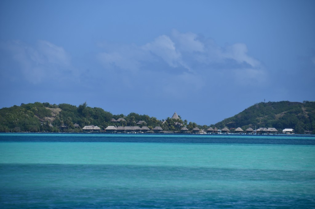 Le lagon me replonge dans le souvenir des eaux bahamiennes. Sous leurs lunettes de soleil, les 4 marins de Balanec (le LIVRE de notre Transatlantique) avaient, en mai 2017, écarquillé les yeux devant une mer caméléon. Bleu outremer, bleu azur, turquoise, indigo, bleu pâle voire blanc laiteux ou carrément translucide. De même, à Bora, les nappes d’eau jouent avec les nerfs des photographes et des peintres : il faudrait s’user les yeux pour se souvenir de tous les bleus.