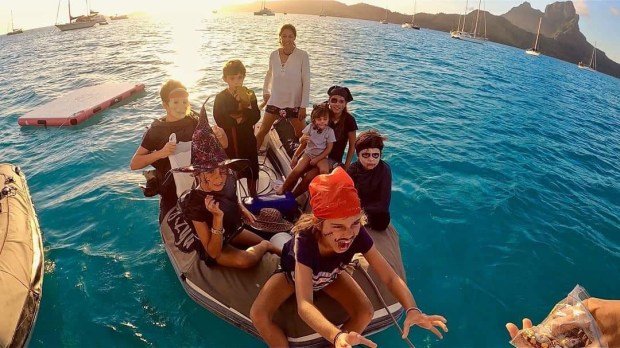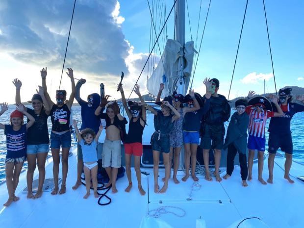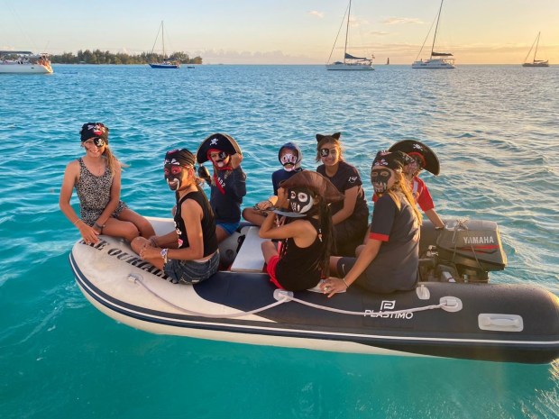 31 octobre : il est unanimement décidé de fêter Halloween, ce quel que soit le pavillon. Déguisés et grimés — plus en pirates qu’en sorcières — la quinzaine de mousses s’élance, au coucher du soleil, à l’assaut de tous les voiliers au mouillage. « Tricks or treats ! Des bonbons ou un sort ! » hurlent-ils depuis leurs annexes. Sympa de voir que tous les équipages, amusés, se prêtent à la mascarade, démontant les planchers pour trouver la moindre sucrerie oubliée. Ou à défaut, des paquets de gâteaux, des tablettes de chocolat et même des chips.