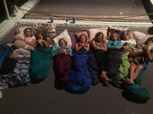 Déjà le soir, personne n’a vu les heures défiler. Les mousses n’ont pas envie de se quitter. Une soirée pyjama s’organise sur le meilleur trampoline de la flottille : celui des Cattleya. Un lit king-king size ultra confortable. Et tant pis s’il pleut. Les plus jeunes ont le sommeil si lourd que certains continueront à ronquer sous les gouttes d’eau !