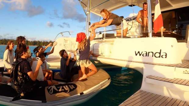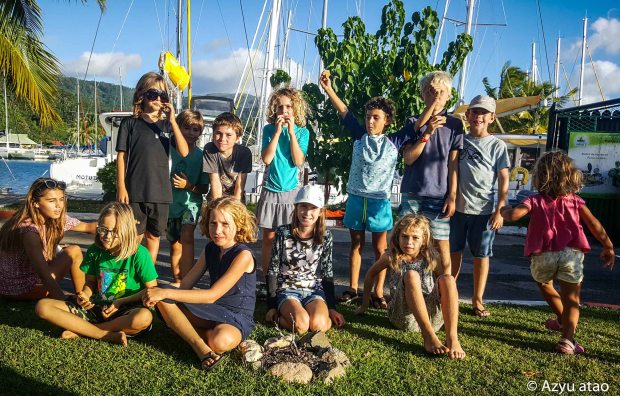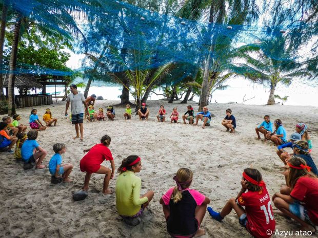 Pour nous, Tahaa, c’est le spot aux potes. Un double anniversaire sur un motu se transforme en Koh Lanta Junior avec une panoplie d’épreuves préparées à l’avance : cocos musicales (à l’arrêt de la chanson, on s’assoit… bin….sur une coco), relais siamois (pas évident de galoper avec un ballon coincé entre deux têtes), course à pied, natation, slake-line, quizz sur les capitales d’Europe… Les jeunes candidats se prennent à tous les jeux et les adultes filment et photographient comme s’ils allaient revendre cher les droits de diffusion. C’est cool, c’est heureux.
