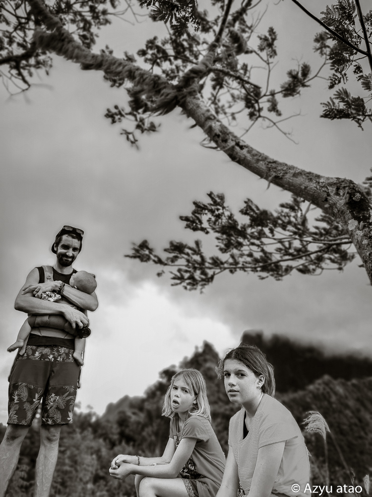 Quelques jours plus tard, nous retrouvons Julien et Mathilde sur Moorea, l’île voisine de Tahiti. Cette fois, la randonnée est familiale : Coline (13 ans), Erell (9 ans), Norah (5 ans) et Tiago (9 mois). Et tout aussi sympa. Quelques hésitations au départ puis nous trouvons le bon chemin. À propos, si vous ne savez pas reconnaître un manguier d’un châtaignier, un goyavier d’un faux-pistachier, vous êtes perdus, à moins de croiser une âme charitable. En Polynésie, les arbres servent de panneaux signalétiques.