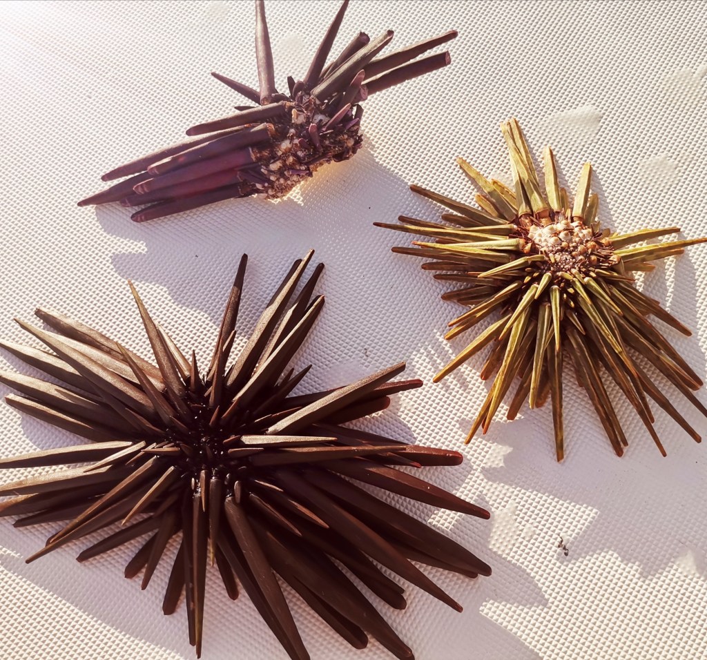 Il en existe des violets, des verts d’eau tirant sur le blanc, des verts kaki. Les oursins se logent dans les anfractuosités du platier.