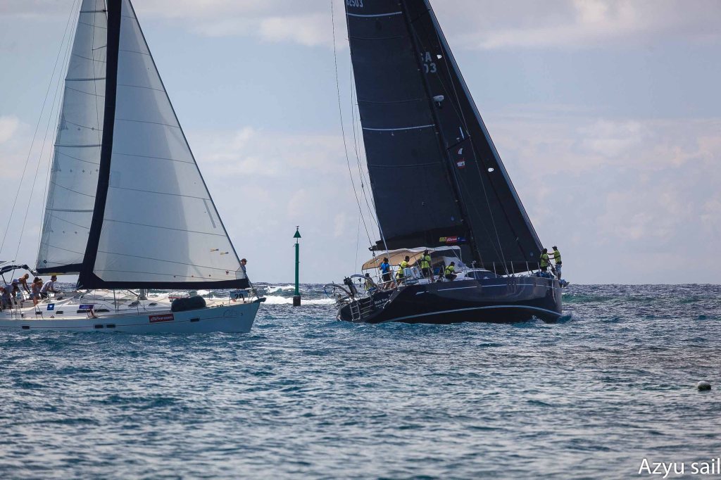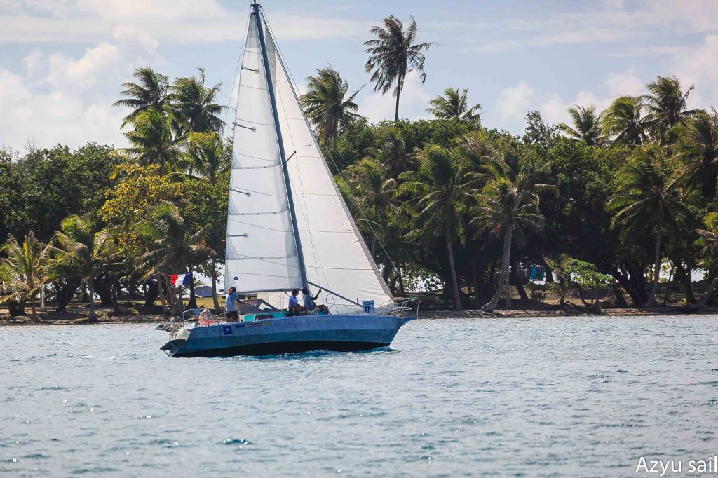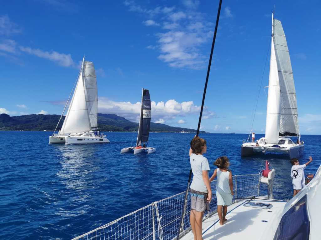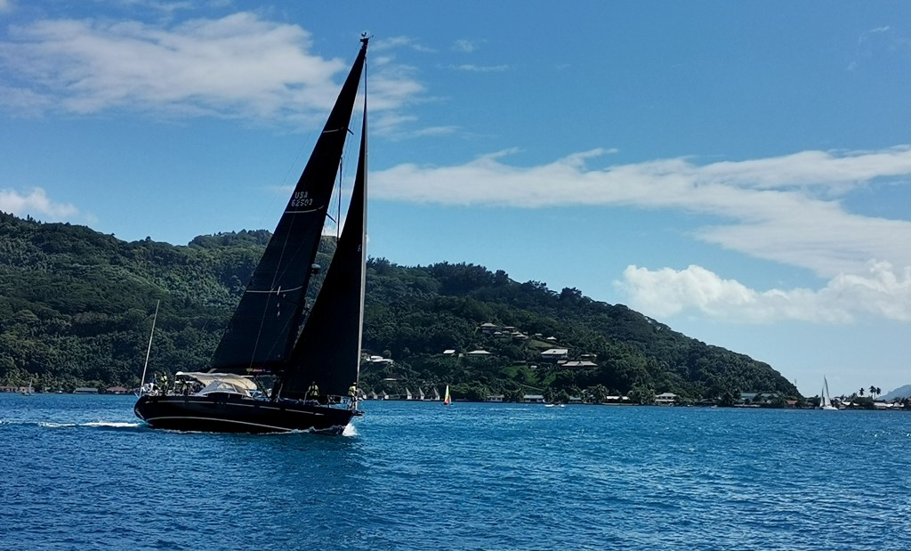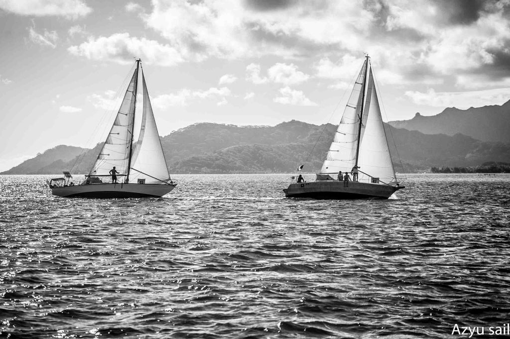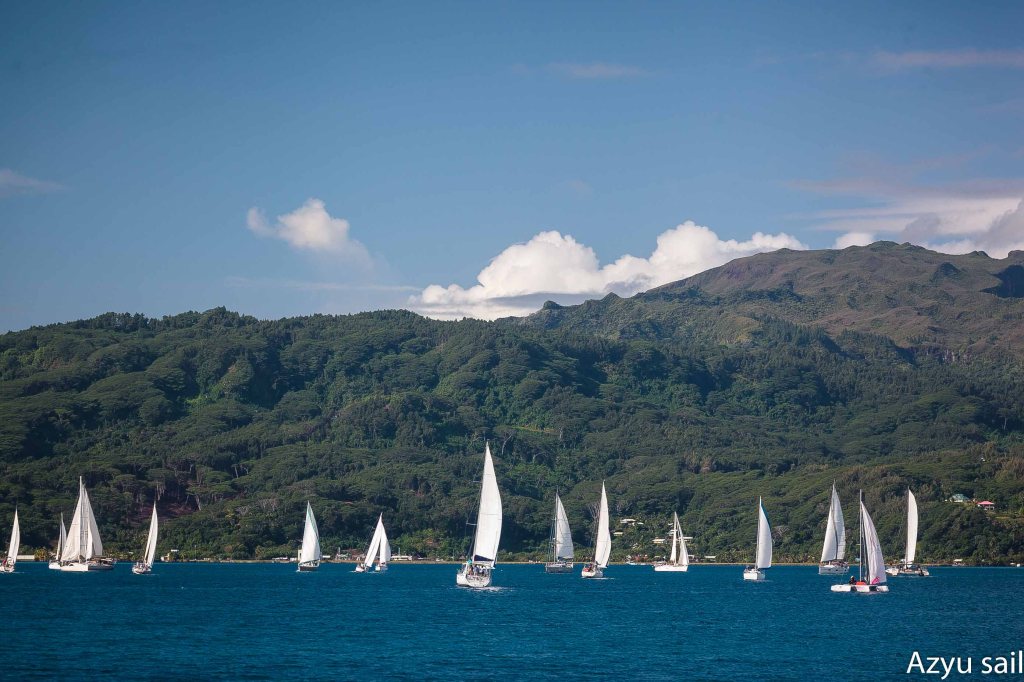 Ce samedi 4 juin, une trentaine de bateaux se positionne entre la ferme perlière Champon et une bouée inratable en forme de rhinocéros soûl. Au top départ, les voiliers se lancent pour le tour du lagon de Taha’a.