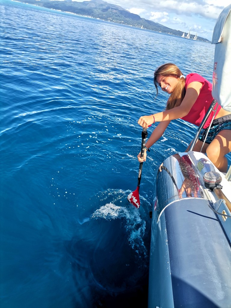 À la 4e heure, on sort les rames ! Sur Azyu, on se relaie tous les 4 pour faire avancer le catamaran à grands coups de pagaies depuis les jupes. Victoire ! On avance à 0,5 noeud ! Les filles essaient même la monopalme pour reposer leurs bras !