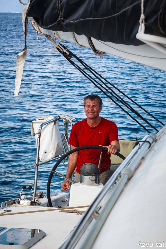 À la 7e heure, comme le soleil se couche sur Bora-Bora, que le courant nous ferait presque reculer, le capitaine craque. Pour sûr, après s’être démené comme un chien, il a envie d’une bière et de repos.