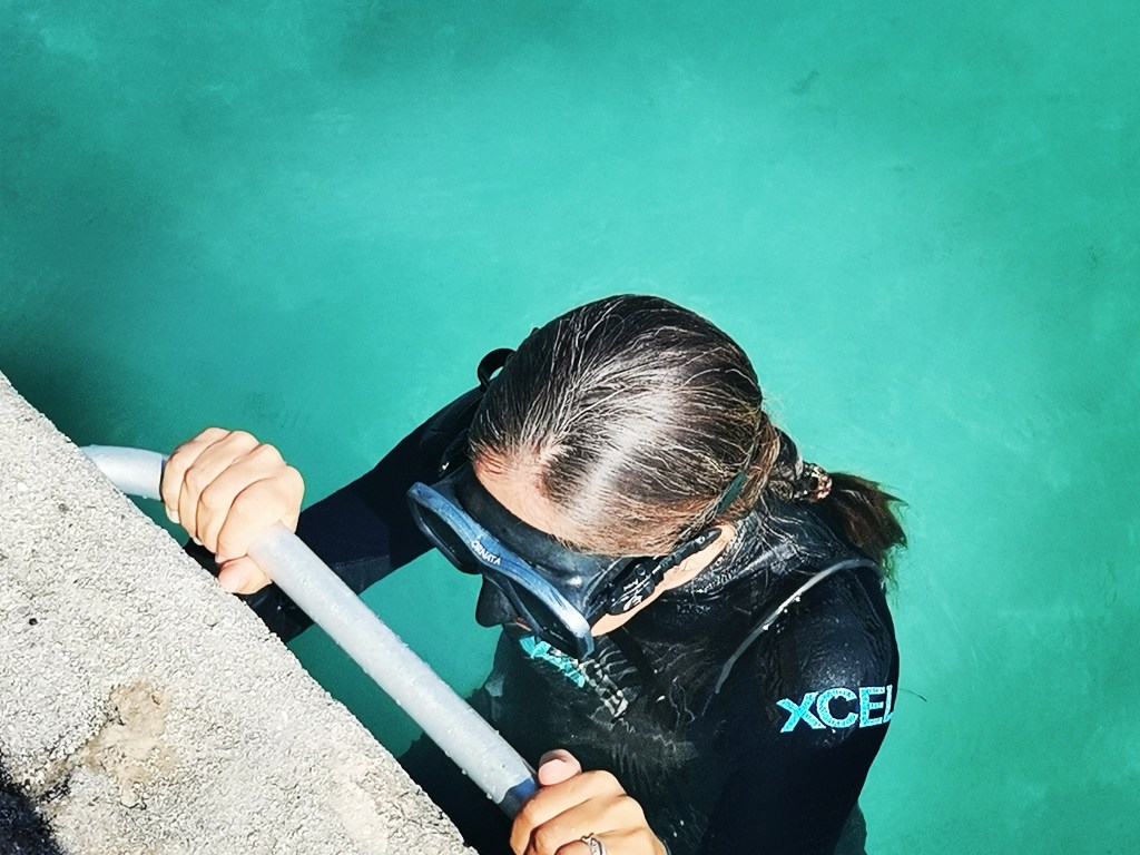 Le test consiste à nager avec palmes mais sans reprendre son souffle sur 55 mètres. Pour nous échauffer, nous enchaînons 16 longueurs de 25 m avec un temps de récupération de plus en plus court. Après une phase de découragement (mais pourquoi je me suis inscrite à ce truc ?!), la magie opère. Le cerveau se débranche, le corps trouve sa position hydrodynamique et, moins on respire, plus c’est facile, limpide.