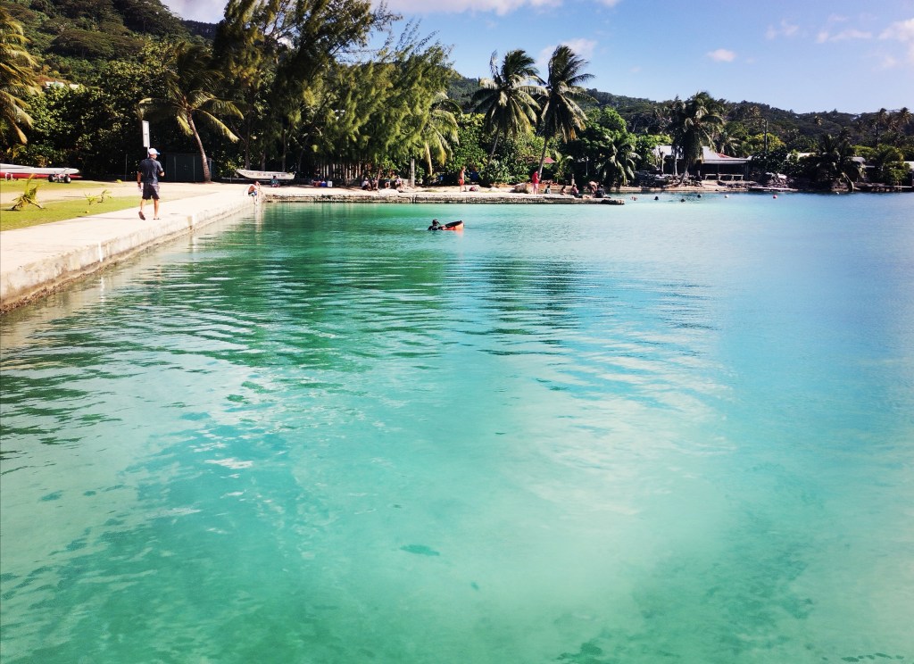 Rendez-vous à la « piscine » de Uturoa avec Adrian. Trois longueurs de quai en forme de U dessinent un semblant de bassin qui s’ouvre à l’infini sur le lagon. Eau de mer donc à 28°, corail au fond et oursins diadème prêts à repousser les intrus. Pour ma part, je préfère ce décor aux carreaux sans poésie d’un établissement chloré.