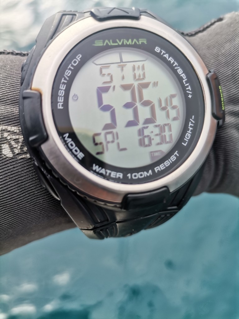 La première, l’apnée statique, nous nous y étions déjà bien entraînés : Jean-Marie garde bien paisiblement la tête dans l’eau plus de 3 mn et moi 5 mn.