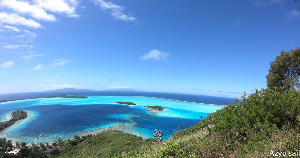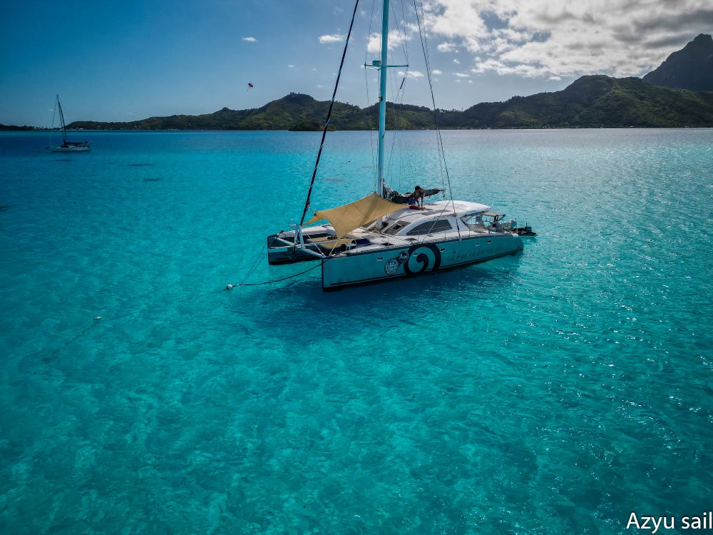 Le catamaran Azyu {Nautitech 47] au mouillage à Bora-Bora et Moorea.
