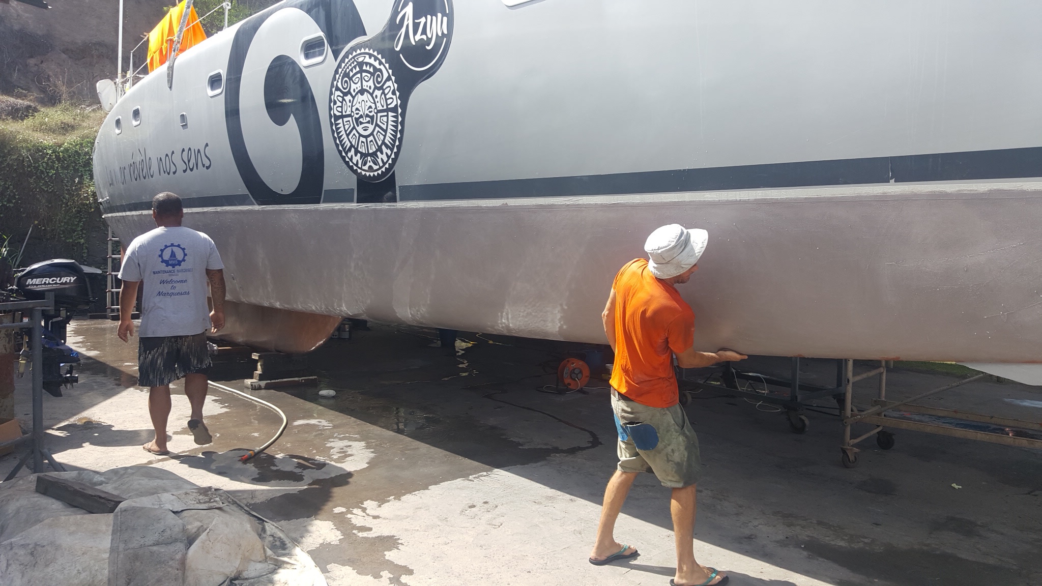 Posé sur l’aire de carénage du chantier naval d’Hiva Oa, aux Marquises, Azyu se fait beau. En vidéo, notre quotidien de rude labeur compensé par une bonne ambiance/