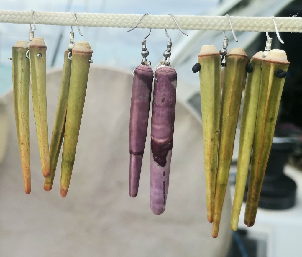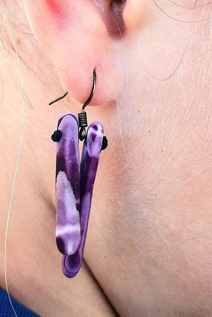 Ambiance ethnique avec les boucles d’oreilles en radioles (aiguilles) d’oursin crayon. Très légères également et pas du tout piquantes, elles se combinent en duo. Coloris : vert ou violet.