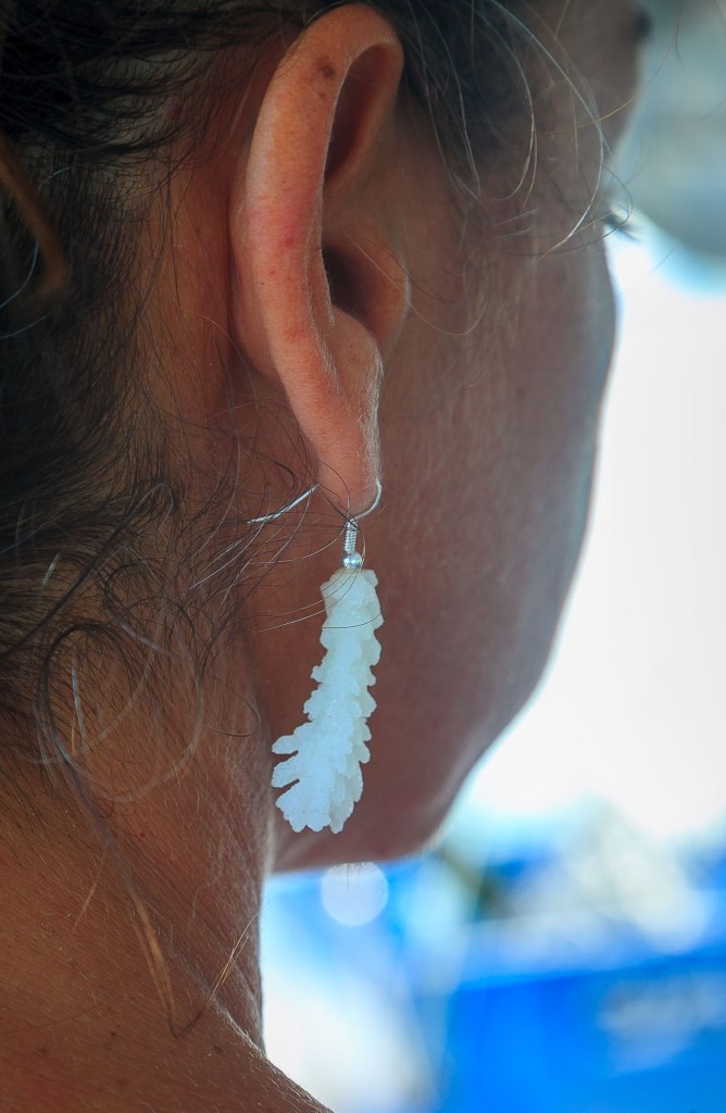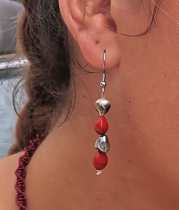 Duo mer-montagne avec ces boucles d’oreilles associant les graines rouges des Marquises et les perles de culture (keshis) des Iles-sous-le-Vent.
