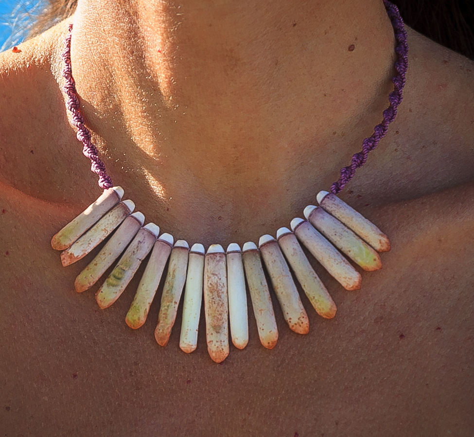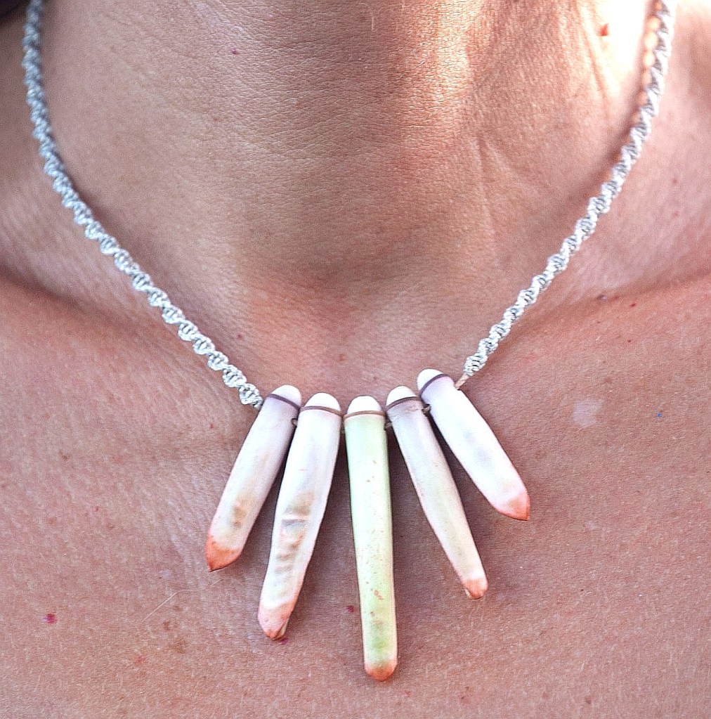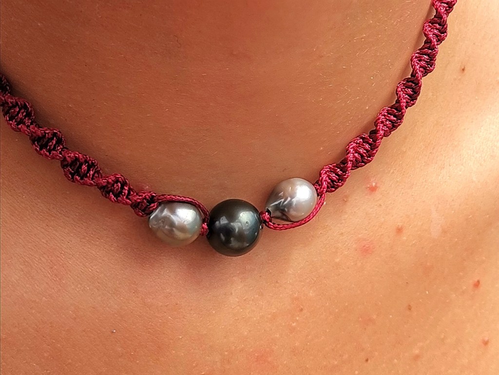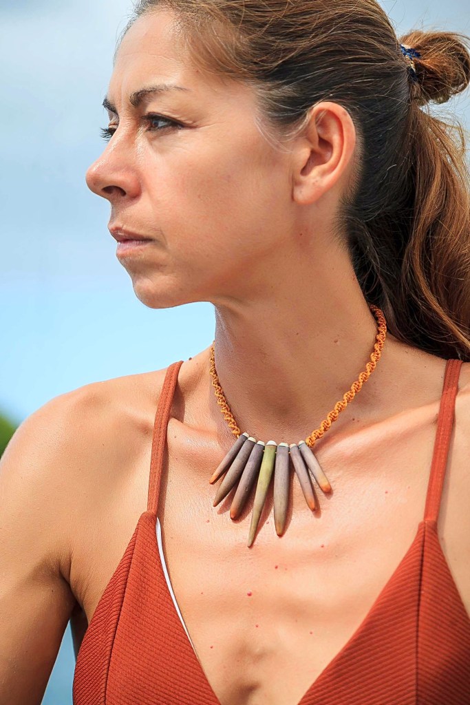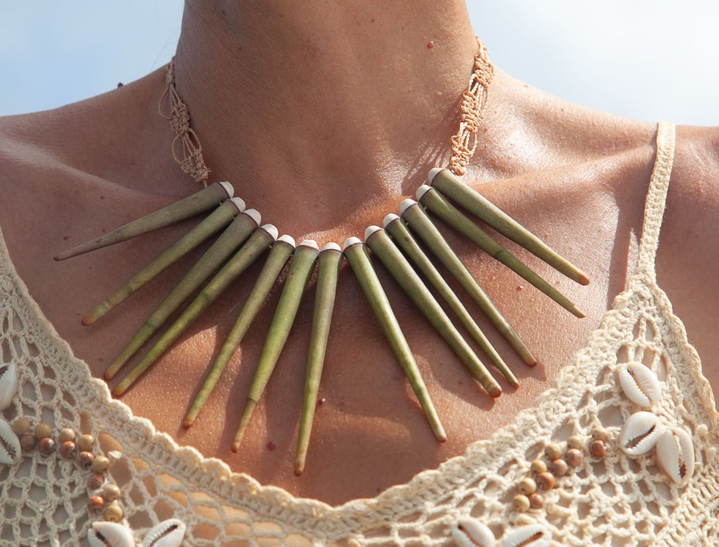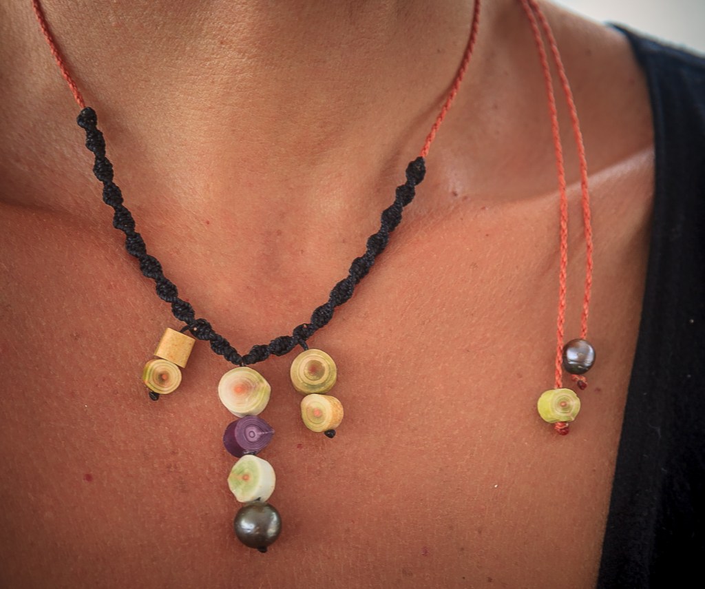 De couleurs variées, les colliers jouent sur les perles de culture, les cônes ainsi que les aiguilles d’oursin crayon. Tous les colliers sont ajustables à votre cou grâce à un nœud macramé coulissant.