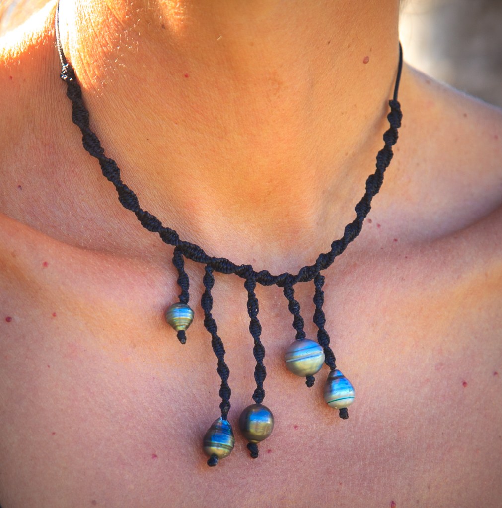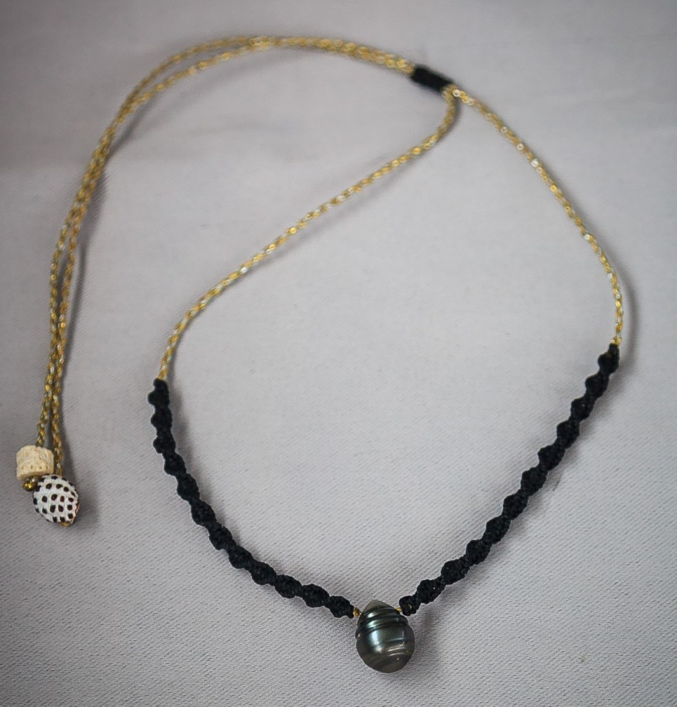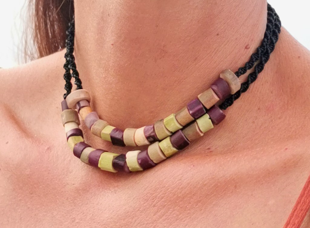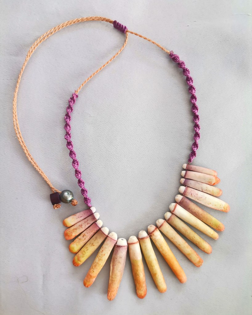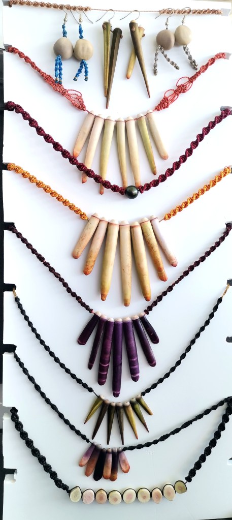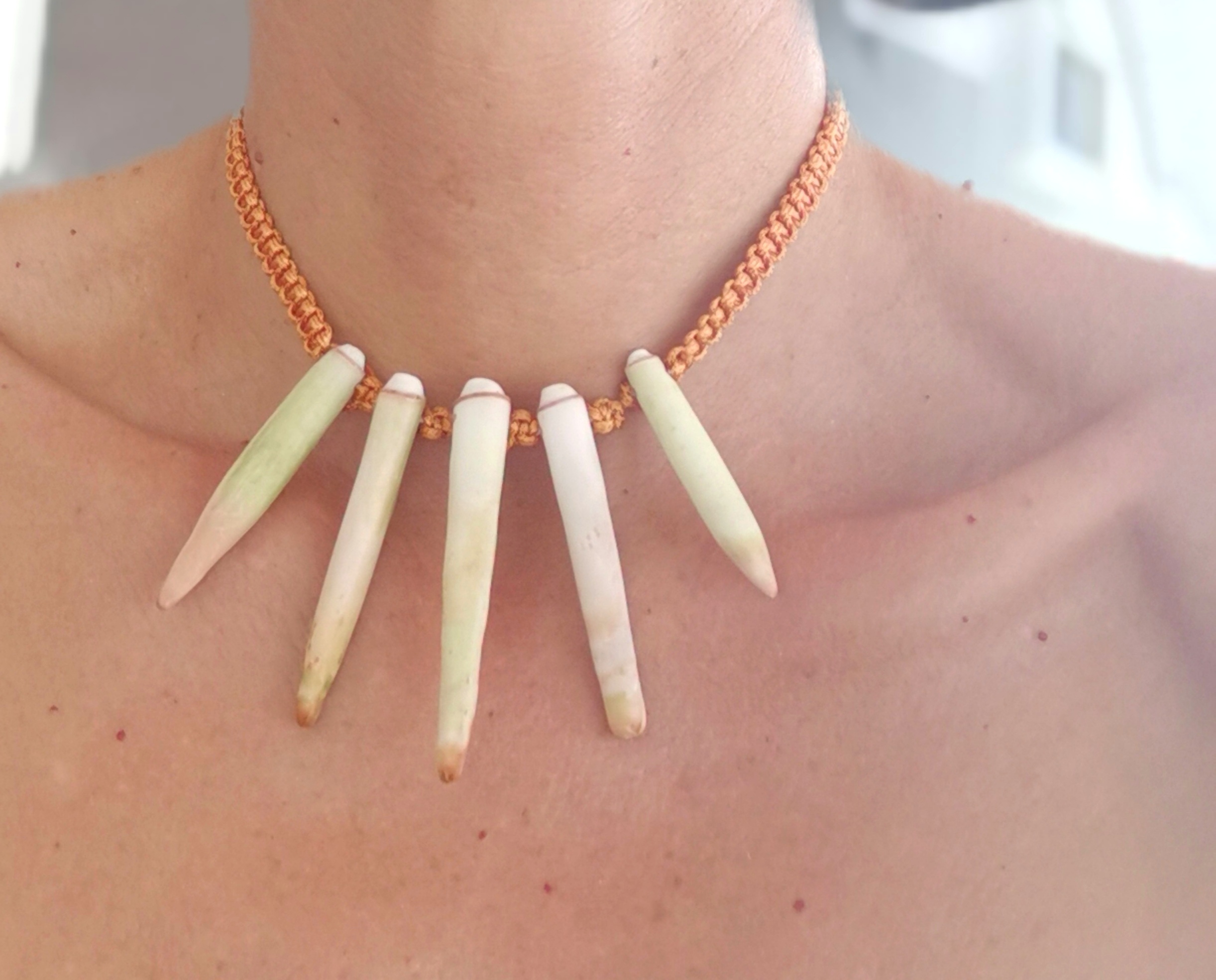 De couleurs variées, les colliers jouent sur les perles de culture, les cônes ainsi que les aiguilles d’oursin crayon. Tous les colliers sont ajustables à votre cou grâce à un nœud macramé coulissant.