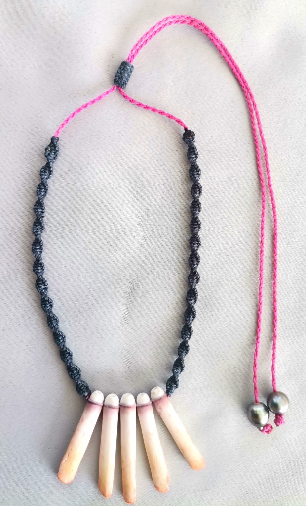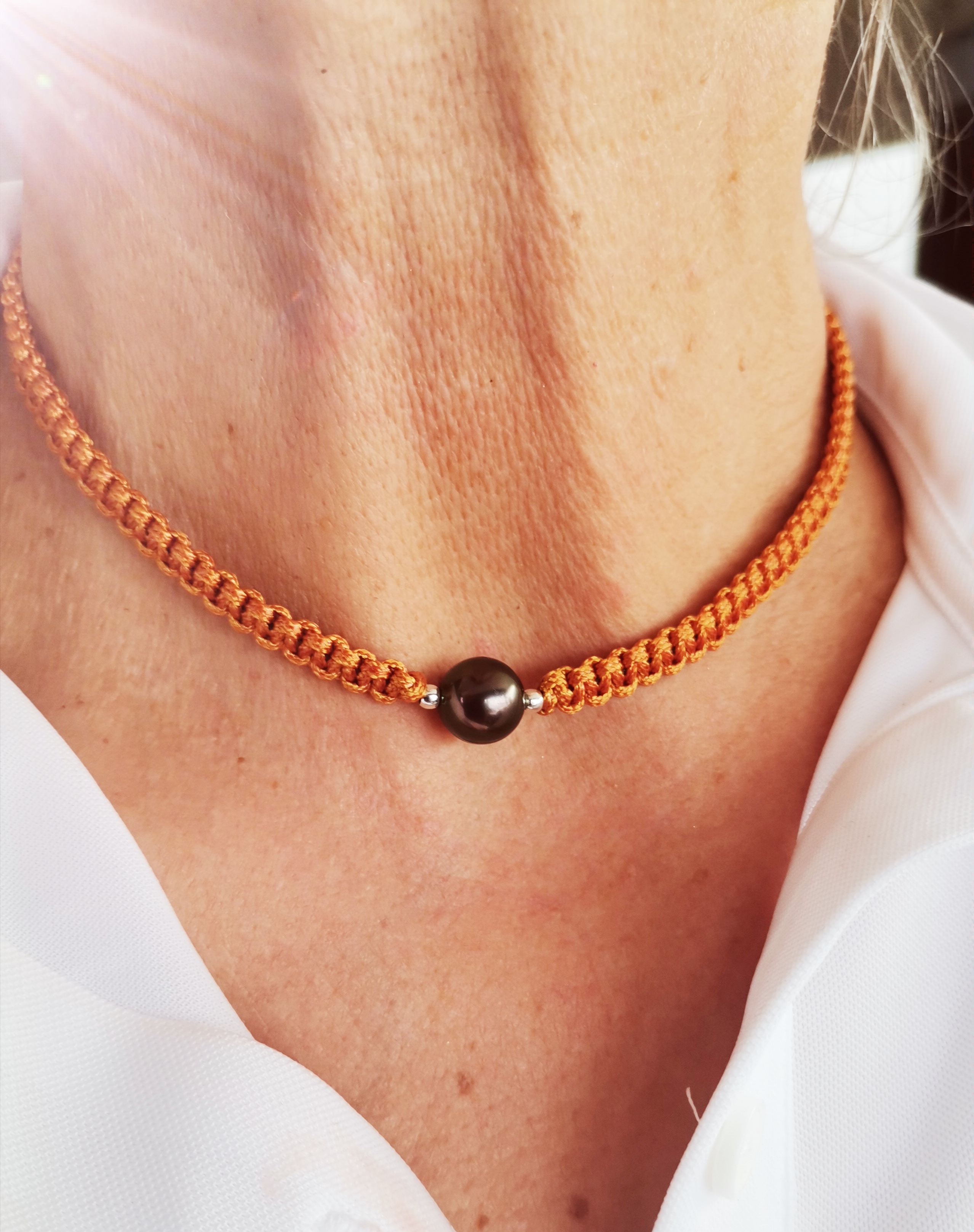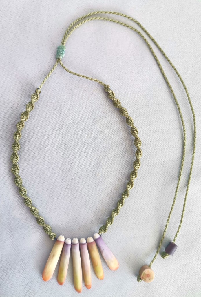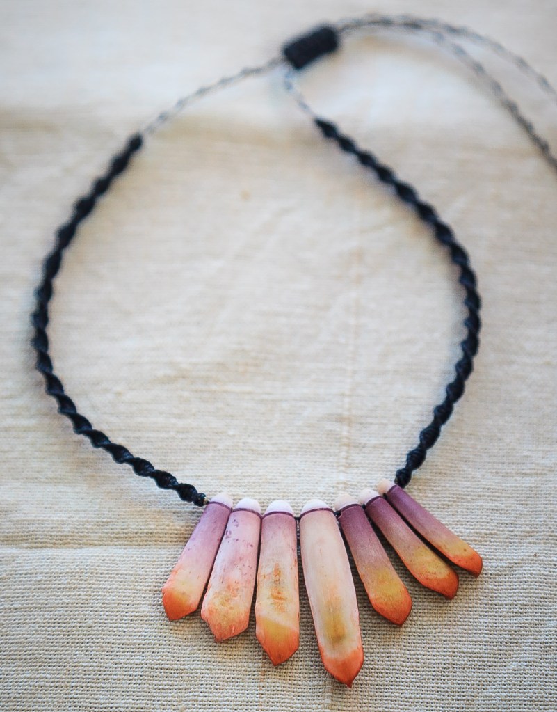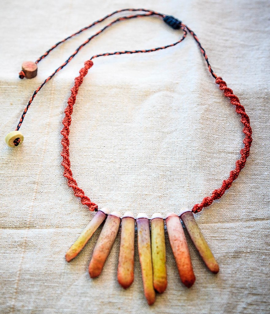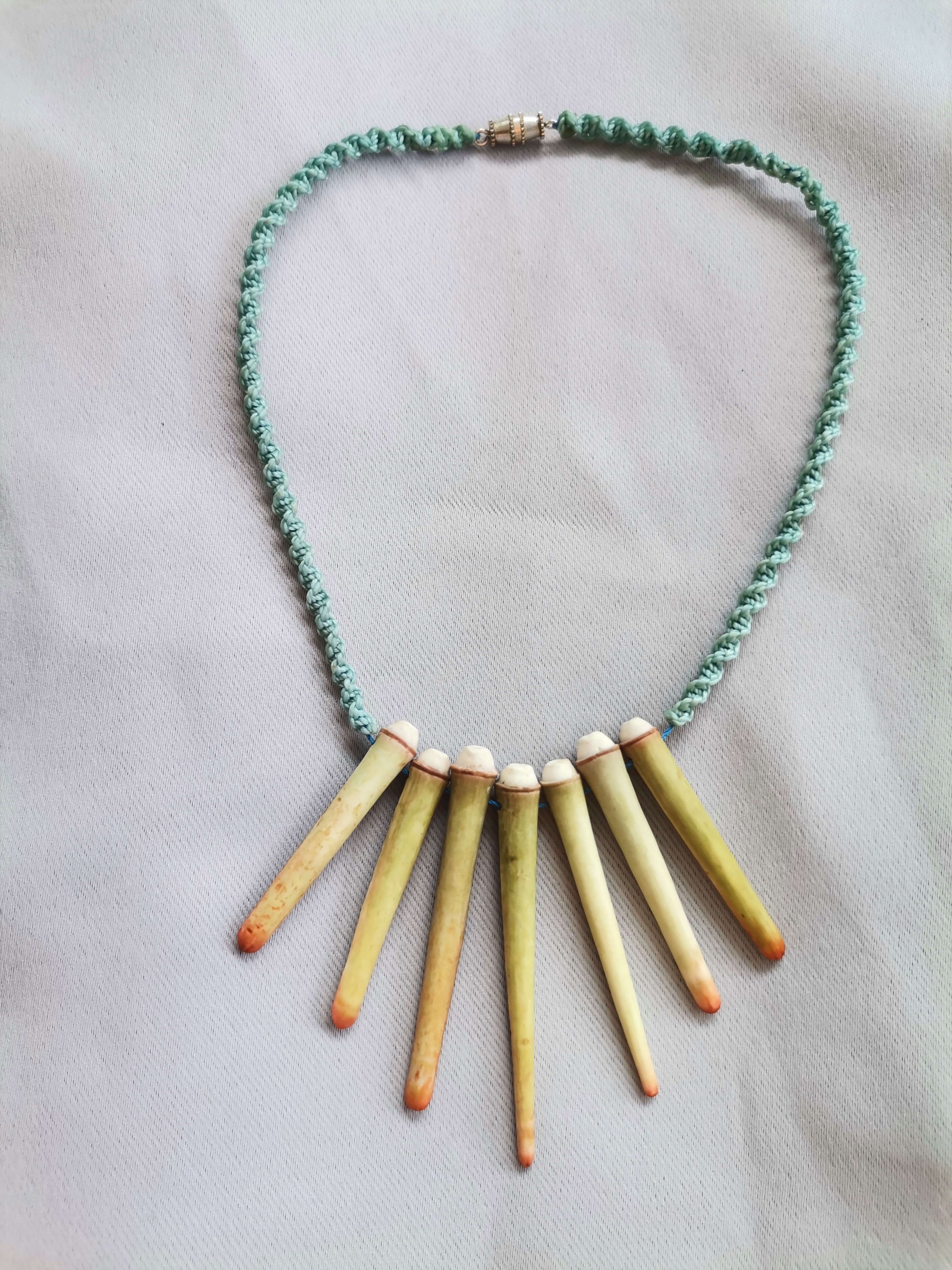 De couleurs variées, les colliers jouent sur les perles de culture, les cônes ainsi que les aiguilles d’oursin crayon. Tous les colliers sont ajustables à votre cou grâce à un nœud macramé coulissant.