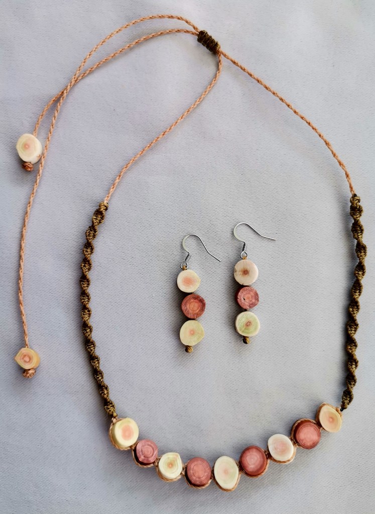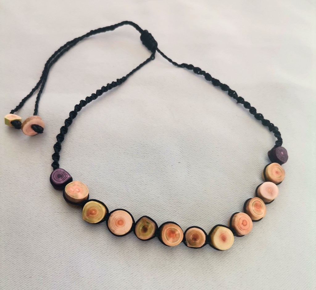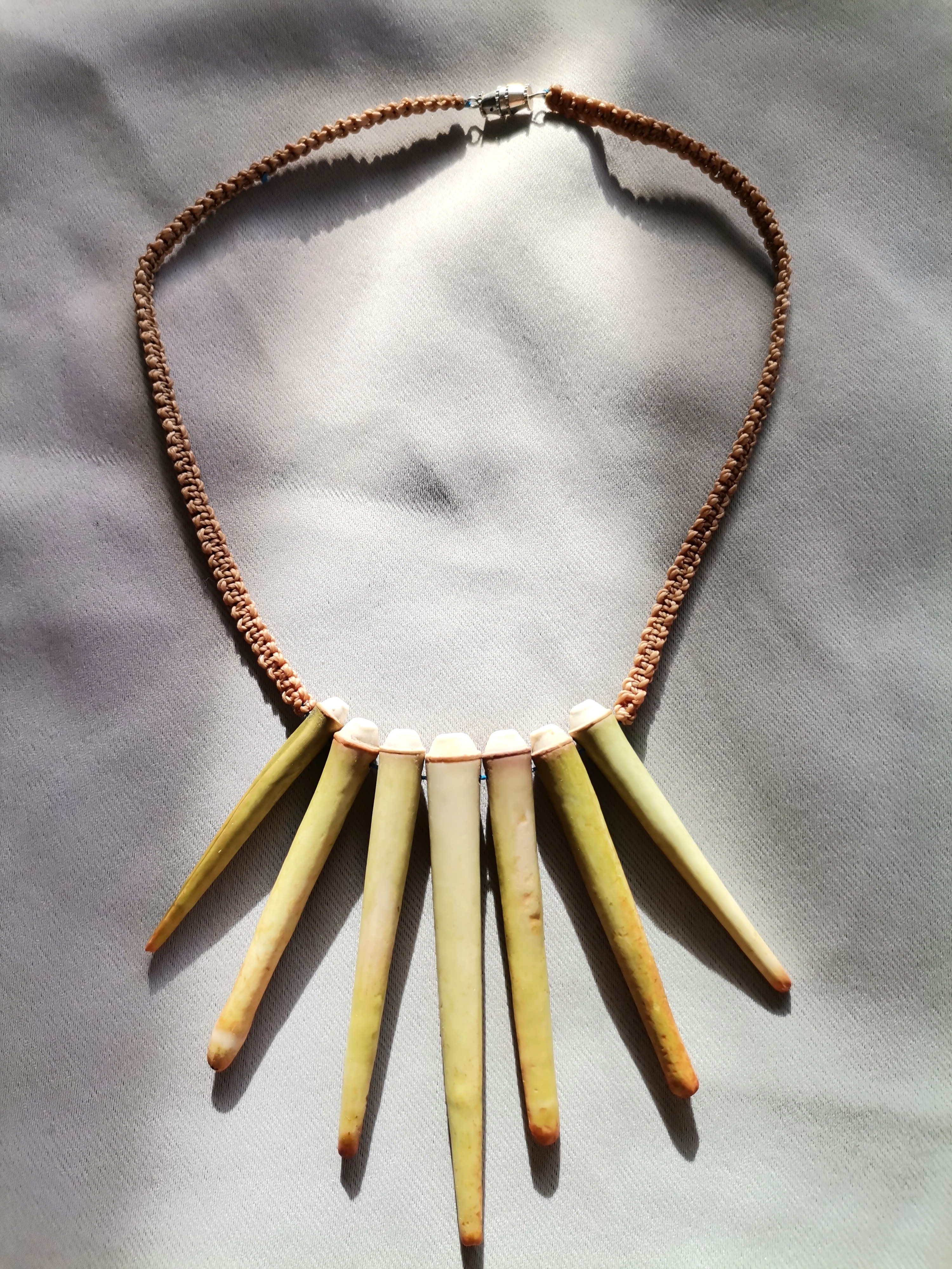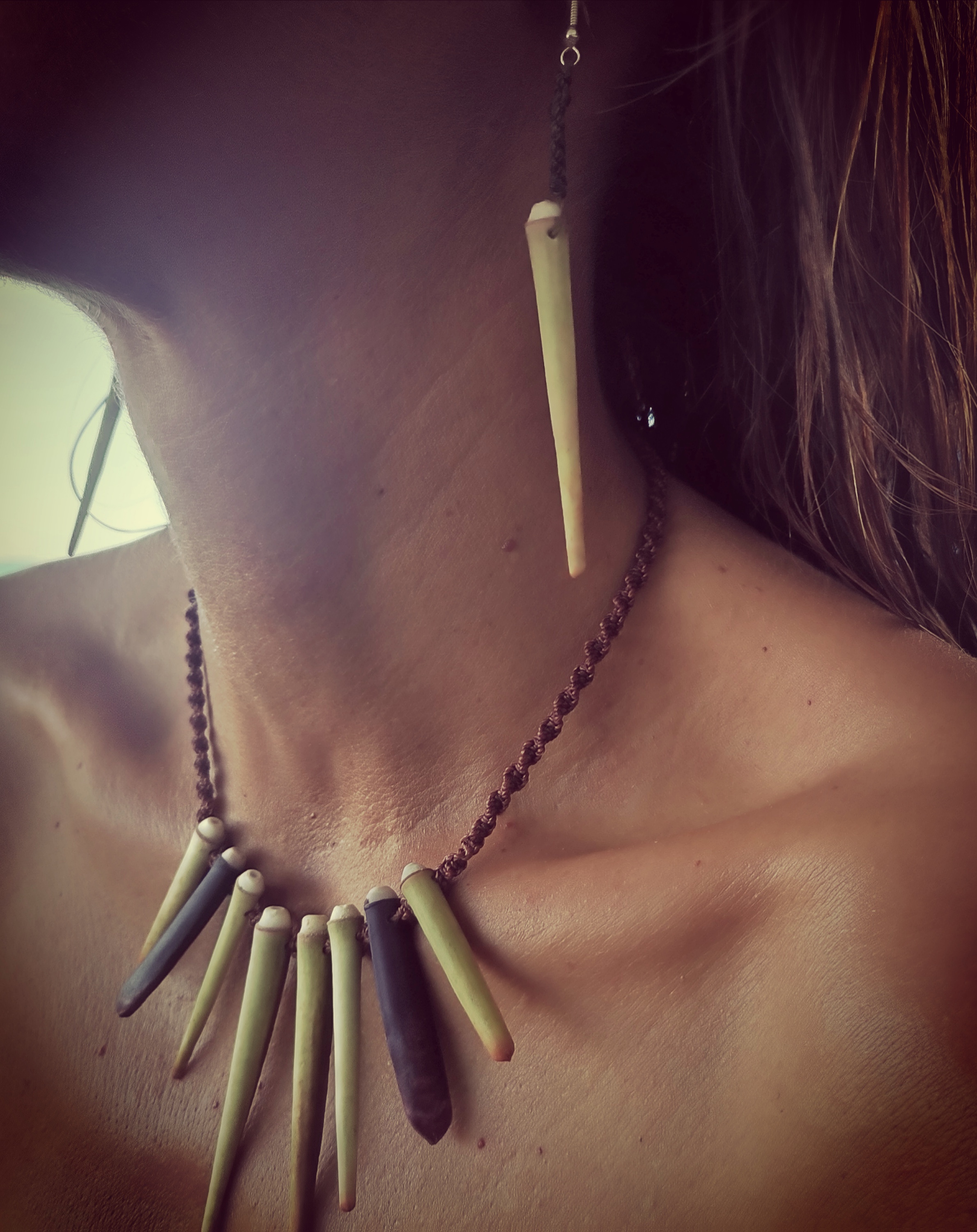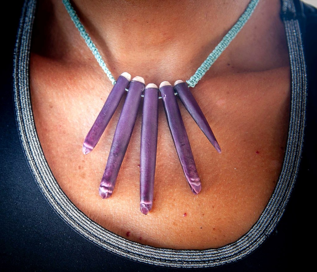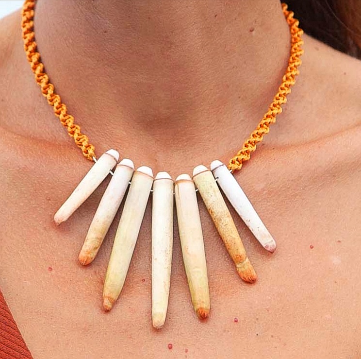 De couleurs variées, les colliers jouent sur les perles de culture, les cônes ainsi que les aiguilles d’oursin crayon. Tous les colliers sont ajustables à votre cou grâce à un nœud macramé coulissant.