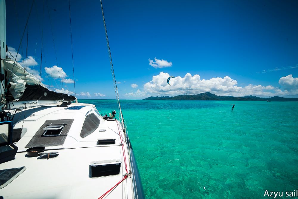 Le catamaran Azyu a été rénové en 2015, sa longueur fait 15m (50 pieds) pour 7,5m de largeur. Les invités sont accueillis dans la coque tribord qui comporte 2 chambres doubles (lit 150cm x 200cm) avec 2 SDB privées, une cabine simple (lit 110cm x 200cm). L’électricité et l’eau douce sont produits à bord, le bateau est entièrement autonome. Réfrigérateur et congélateur, ventilateur dans chaque cabine, Wifi à bord.
