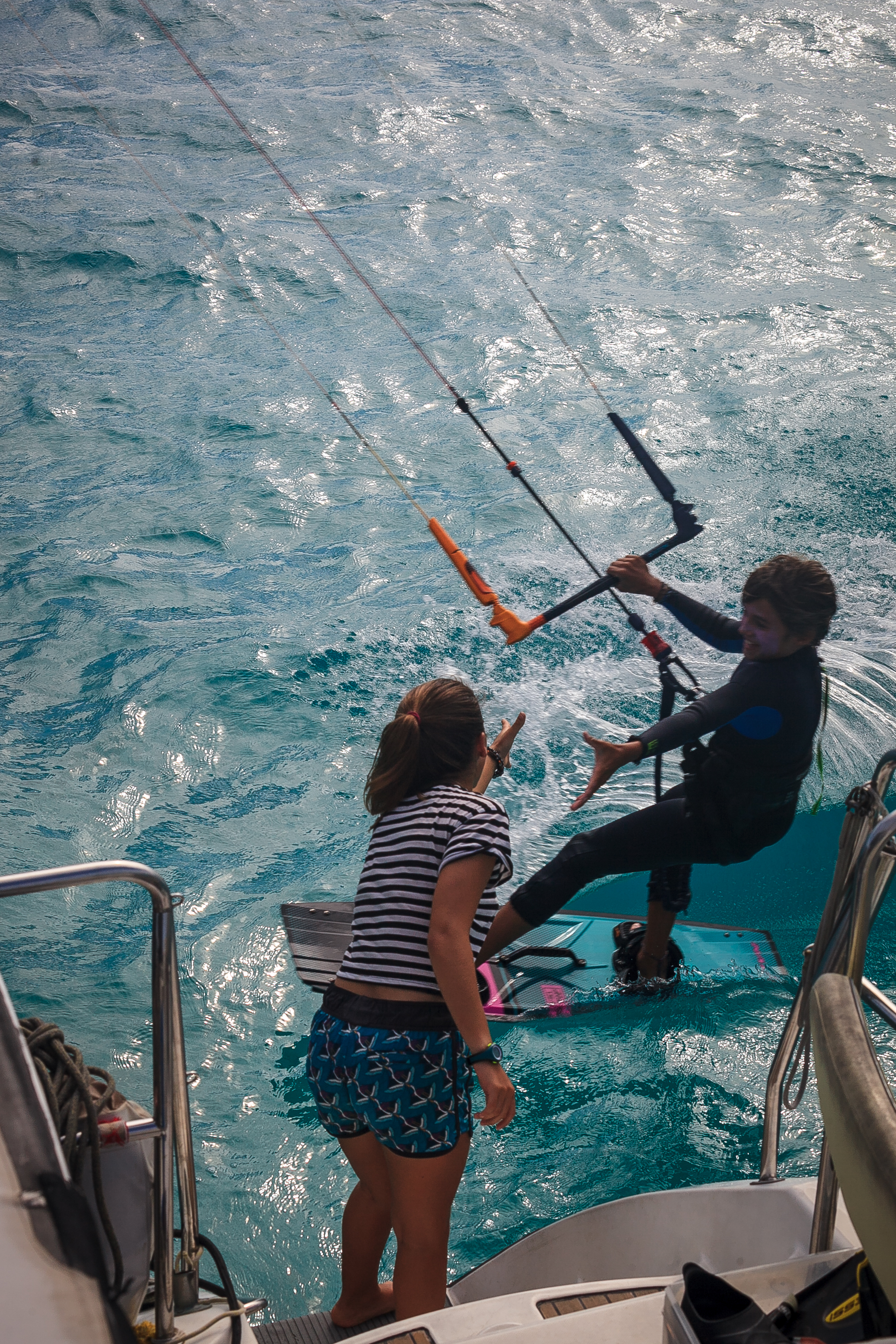 Embarquez sur notre catamaran, pour une croisière adaptée à vos envies. Nous naviguons quelques heures chaque jour pour trouver le meilleur spot selon l’orientation du vent. Vous préparez votre matériel sur la grande plage avant du catamaran, la mise à l’eau se fait par les jupes arrières en toute sécurité. Le catamaran est au mouillage sur un fond de sable derrière la barrière de corail, terrain de jeu immense dans 2m d’eau turquoise. Possibilité, selon votre niveau, de naviguer dans les vagues au niveau des passes.