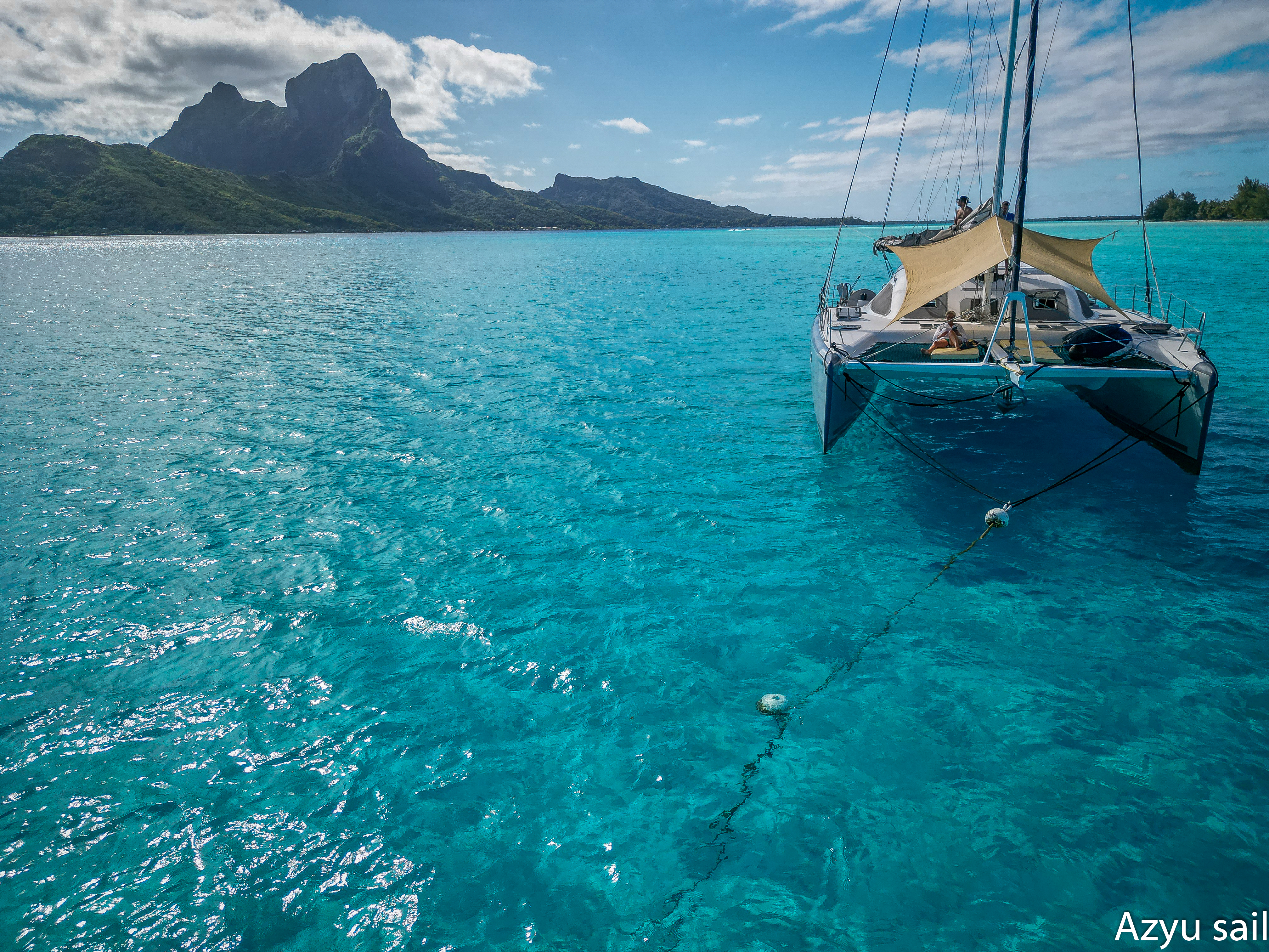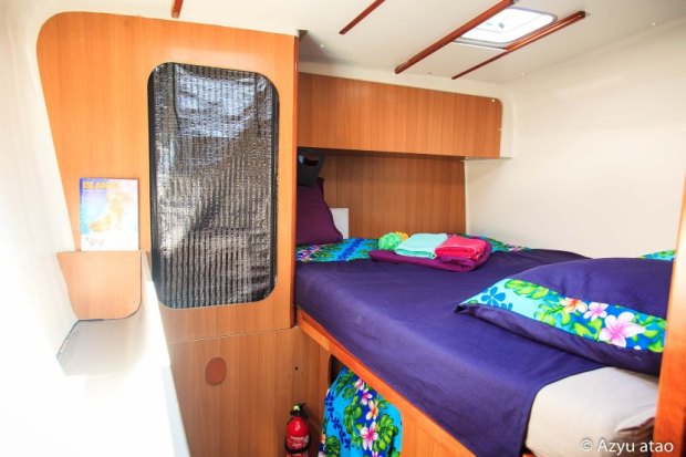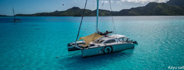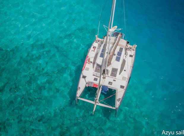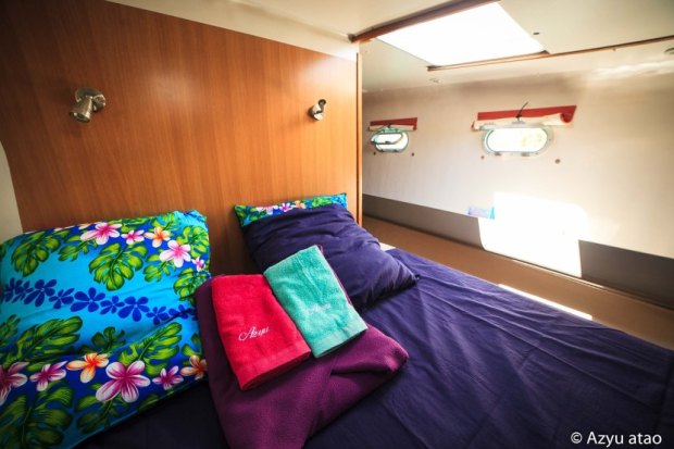 Le catamaran Azyu a été rénové en 2015, sa longueur fait 15m (50 pieds) pour 7,5m de largeur. Les invités sont accueillis dans la coque tribord qui comporte 2 chambres doubles (lit 150cm x 200cm) avec 2 SDB privées, une cabine simple (lit 110cm x 200cm). L’électricité et l’eau douce sont produits à bord, le bateau est entièrement autonome. Réfrigérateur et congélateur, ventilateur dans chaque cabine, Wifi à bord.