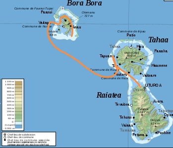 Exemple de croisière (parcours en orange) permettant de visiter les îles de Taha’a et Raiatea dans l’archipel des Iles sous le vent.