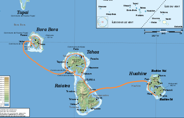 Exemple de croisière (parcours en orange) permettant de visiter 5 îles de l’archipel de la Société.