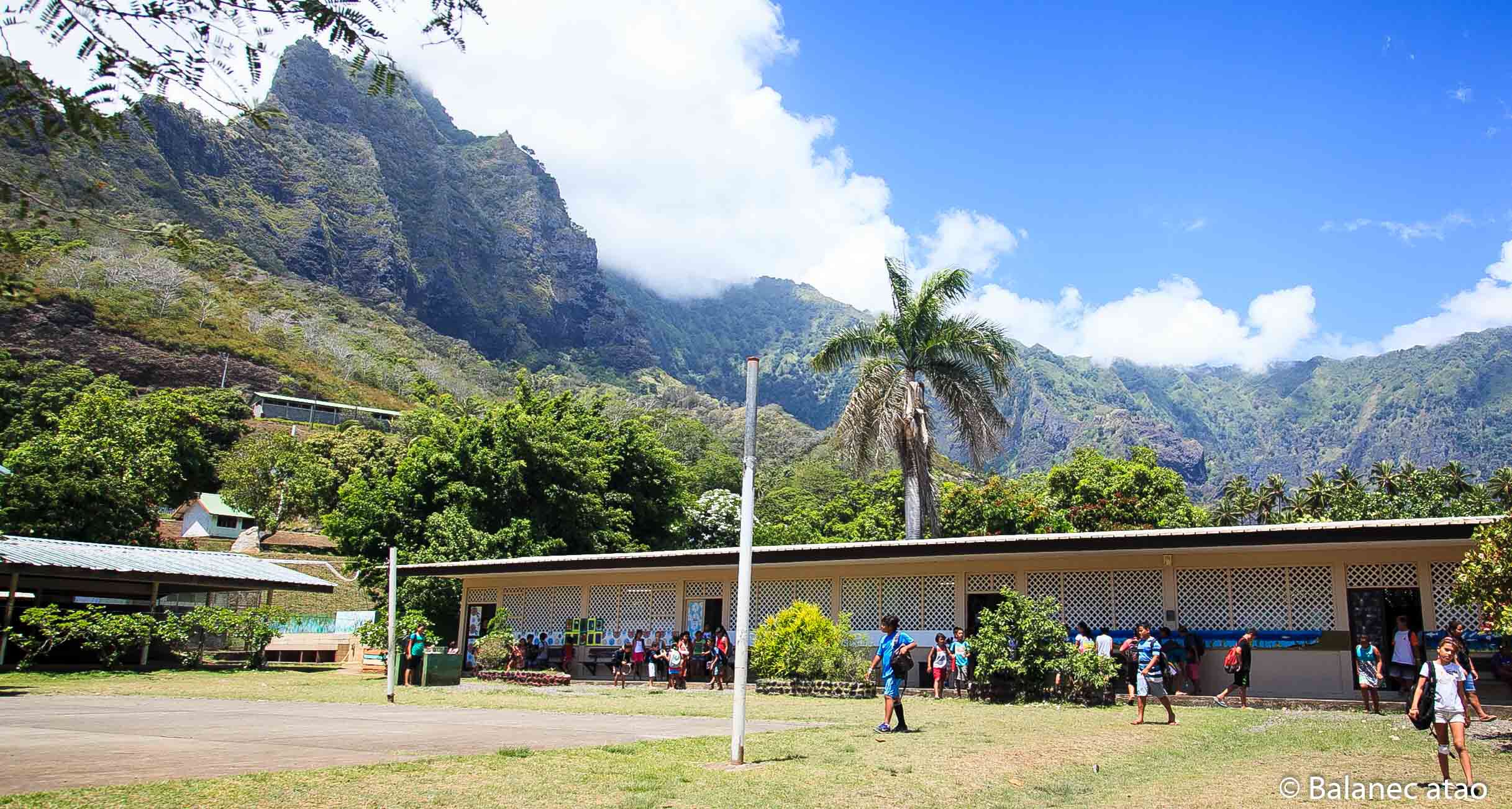 Escale rallongée à Hiva Oa pour cause d’école sympa. Coline (11 ans) et Erell (7 ans) nous font visiter l’école primaire publique d’Atuona qui compte 130 élèves, 10 poulettes et un chien.