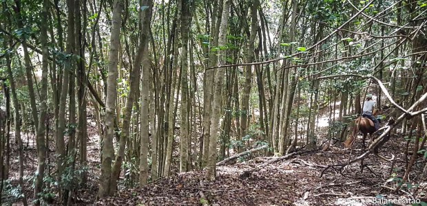 Hissés sur Teken, Jaguar, Paepae et Camion, nous partons au pas sur une petite route quand nous croisons un cheval blanc à peine débourré ; ses ruades barrent notre passage. Comme nombre d’autres compatriotes, il est attaché par une corde à un arbre en bord de route. Vu sa nervosité et son attitude frondeuse, il semble avoir été capturé depuis peu. Une situation familière pour notre guide. En effet, Jérémie attrape lui-même étalons et juments dans la forêt (une trentaine par an) soit pour les propriétaires des terres sur lesquelles gambadent les équidés soit pour son propre compte. Qu’il accule les bêtes convoitées dans un enclos ou qu’il s’en empare au lasso, c’est toujours à l’issue d’une longue et harassante journée de marche.