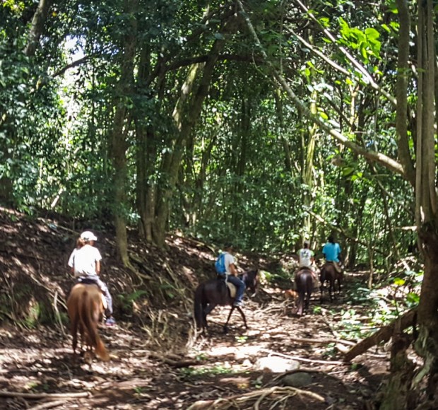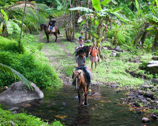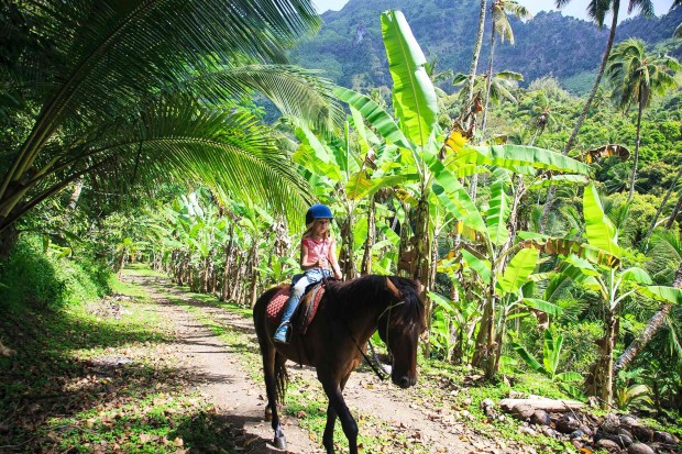 « Vous savez monter ? » Mis à part Jean-Marie qui se remémore avec nostalgie des chevauchées dans les steppes mongoles, Lili, Pierre et moi n’avons que peu d’expérience. Mais une furieuse envie de parcourir vallées et flancs de montagne du haut de ces braves et doux destriers. Introduit dans l’archipel via les Européens (au XVIe ou XIXe siècle selon les historiens), le cheval est toujours utilisé sur les chemins non carrossables, notamment pour transporter le coprah.